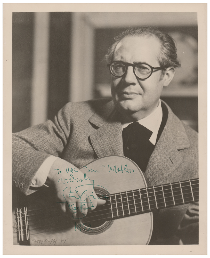 Spanish classical guitarist (1893-1987) regarded as one of the greatest players in the history of the instrument. Vintage glossy 8 x 10 photo of Segovia with his guitar, signed and inscribed in fountain pen, "Cordially, Andres Segovia, 1952." In very good to fine condition, with overall vertical rippling.