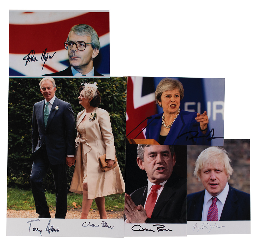Five color glossy photos of British prime ministers, ranging in size from 4 x 5.75 to 7 x 9.5, each signed in ink by the subject: Boris Johnson, Tony Blair (and wife Cherie), Gordon Brown, John Major, and Theresa May. In overall fine condition.