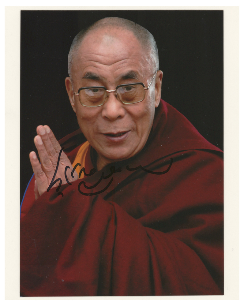 Glossy 5 x 7 photo of the Dalai Lama in his iconic robes, signed in black felt tip. Affixed to a slightly larger mount and in fine condition.