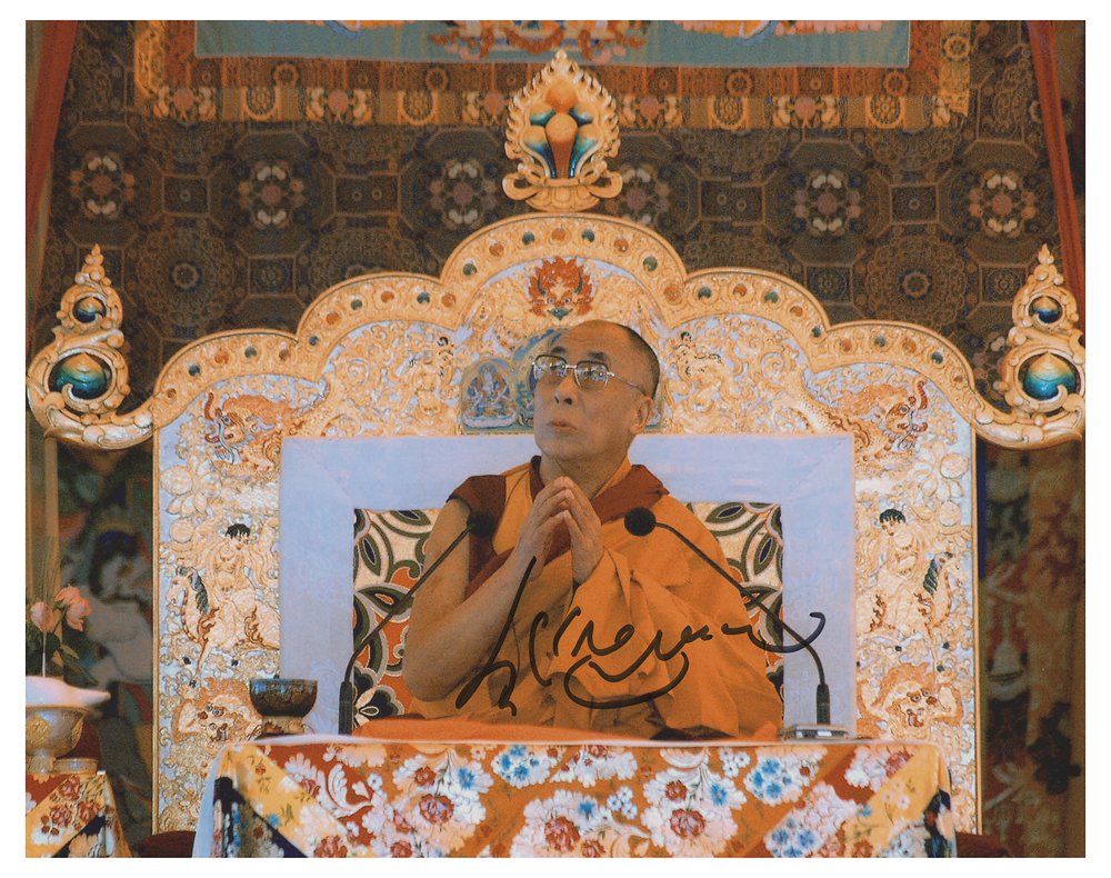 Color satin-finish 10 x 8 photo of the Dalai Lama during a religious ceremony, signed in Tibetan in black felt tip. In very good to fine condition, with creasing to the corners.
