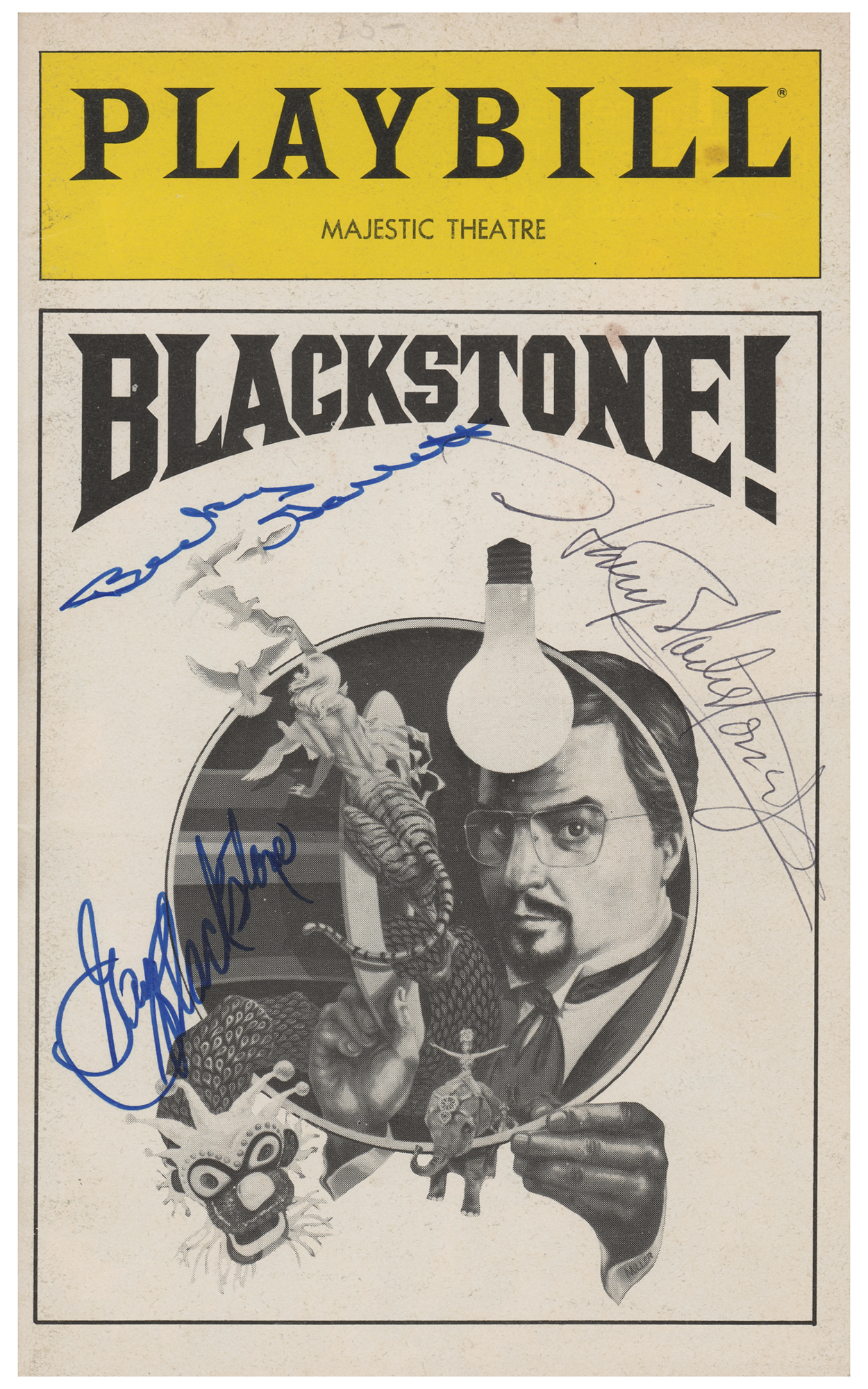 Bank check, 6.25 x 2.75, filled out and signed by Blackstone, Sr., "Harry Blackstone," payable to his son, "Harry B. Blackstone, Jr.," for $75, June 9, 1952; endorsed on the reverse by the younger Blackstone, "Harry B. Blackstone, Jr." Includes a playbill for Blackstone at the Majestic Theatre, signed on the front cover in ink by Harry Blckstone, Jr., Gay Blackstone, and Becky Garrett. In fine condition.