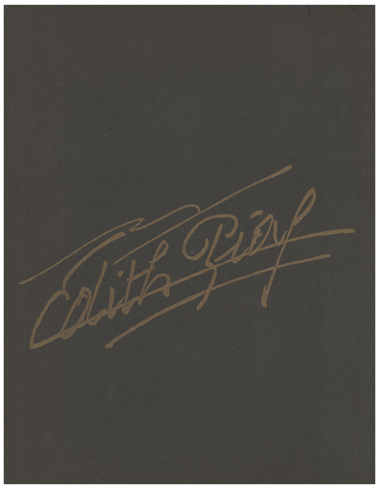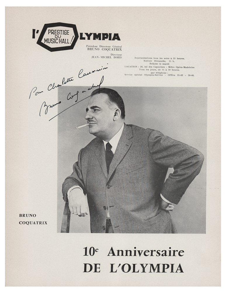 Program for the 10th anniversary of the Paris Olympia music hall, 9.5 x 12, signed and inscribed inside by Edith Piaf, Bruno Coquatrix, Theo Sarapo, Renee S. Passeur, and Andre Aubert. The front cover features Piaf's facsimile signature in gold, and a facsimile signature also appears on the signed page. In fine condition.