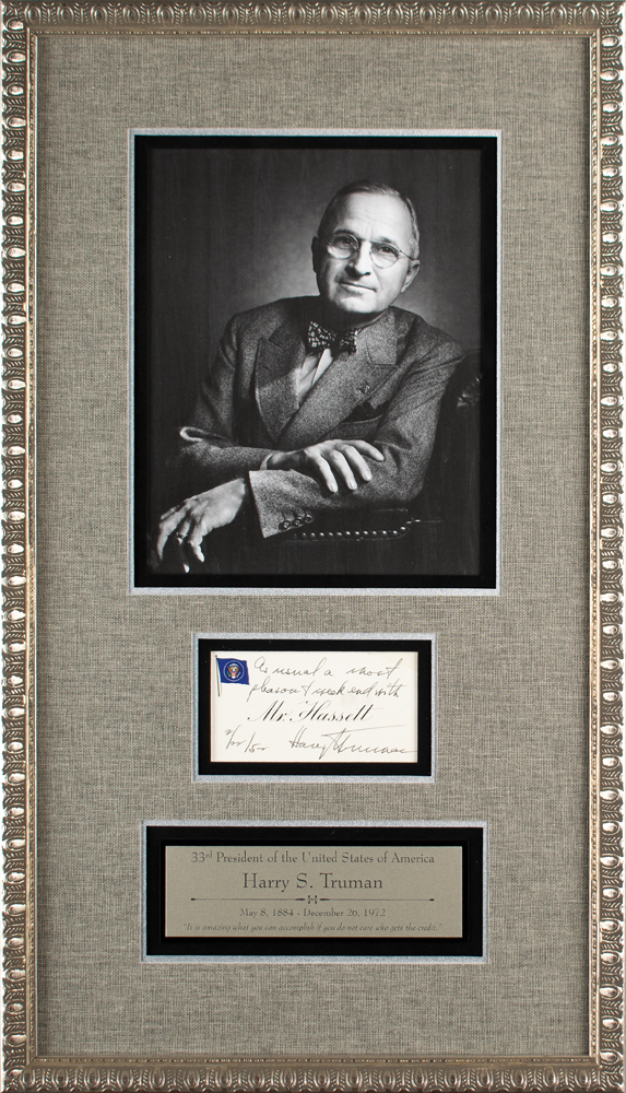 Ink signature and inscription as president, "As usual a most pleasant weekend with [Mr. Hassett], Harry S. Truman, 2/22/52,” on an off-white 4 x 2 place card bearing an embossed presidential flag. Beautifully cloth-matted and framed with a plaque and portrait of Truman to an overall size of 12 x 21. In fine condition. Accompanied by a full letter of authenticity from JSA. This place card was used aboard the presidential yacht, U.S.S. Williamsburg, during the period Truman was aboard: February 21 to 24, 1952. Hassett served as correspondence secretary under President Truman after President Roosevelt died in 1945, serving until 1952.