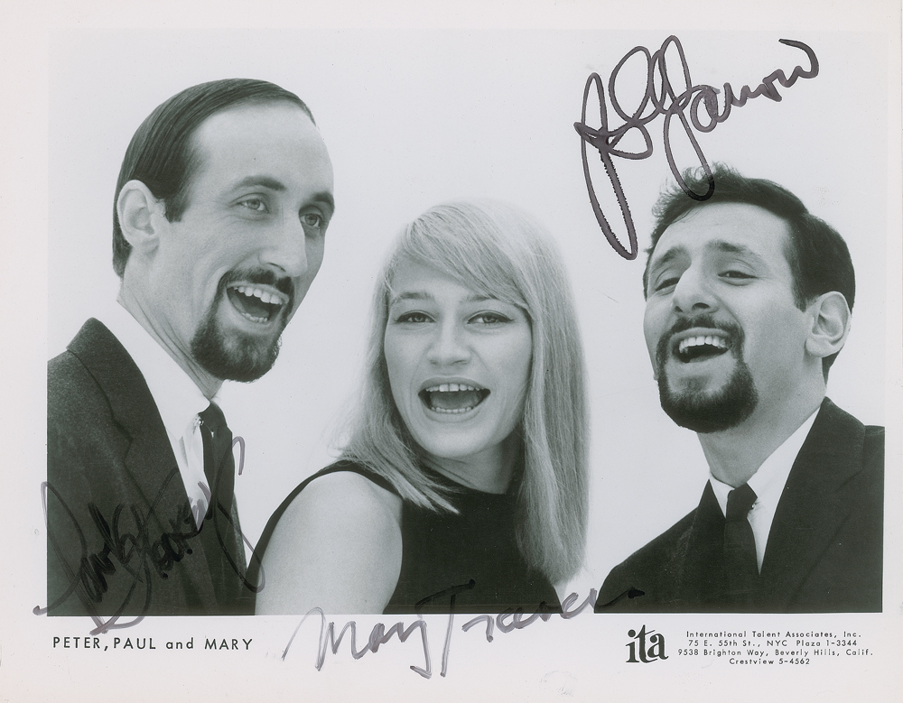 Glossy 10 x 8 publicity photo of the New York City folk trio, signed in black felt tip by Peter Yarrow, Paul Stookey, and Mary Travers. In fine condition.