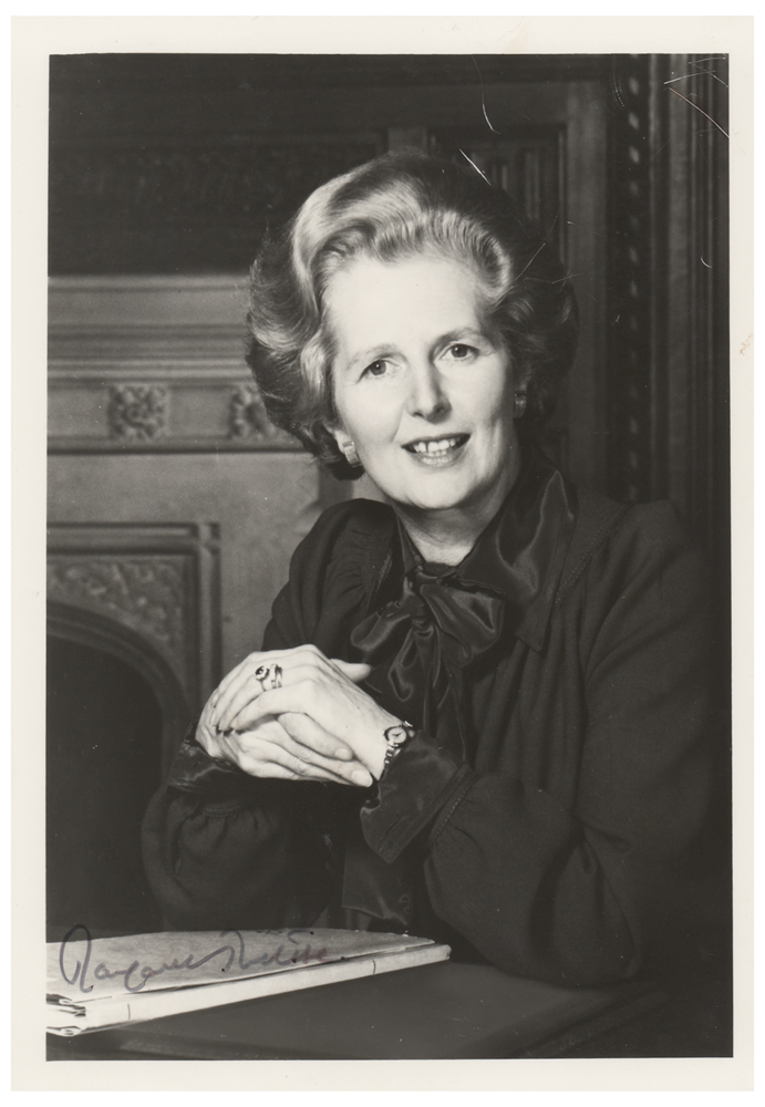 Glossy 5 x 7 photo of Margaret Thatcher at her desk, signed in black felt tip. In fine condition.