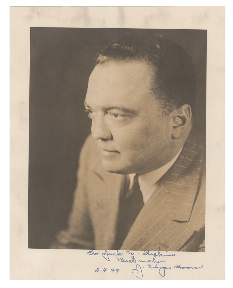 Vintage matte-finish 8.5 x 11 photo of Hoover, signed and inscribed in the lower border in fountain pen, "To Jack N. Hoskins, Best wishes, J. Edgar Hoover, 2.4.49." In fine condition, with mine staining and slight rippling to upper border.
