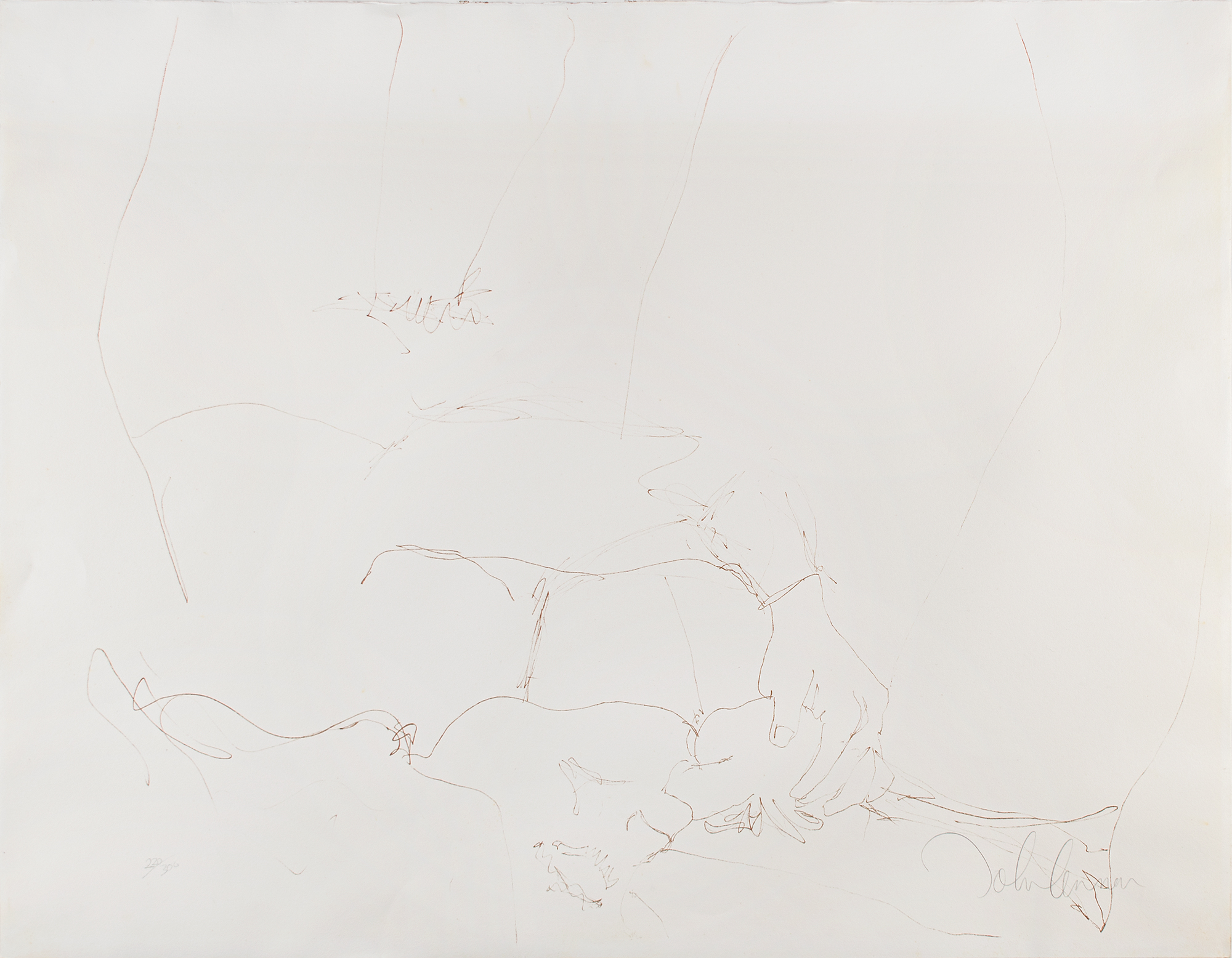 In 1969, as a wedding gift for Yoko, John drew the 'Bag One Portfolio'—a chronicle of their wedding ceremony, honeymoon, and their plea for world peace in the Bed-In. The following year the artwork was produced in a series of three hundred portfolios of fifteen signed prints each. The majority depict John and Yoko's most intimate, private moments—upon their first exhibition in London, more than half were deemed 'indecent' and confiscated by Scotland Yard. The complete set of Bag One lithographs is on permanent display at the Museum of Modern Art in New York.