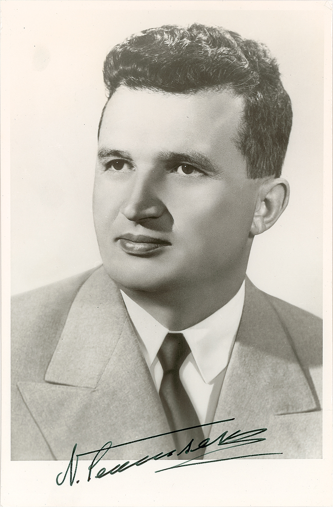 Longtime and widely reviled leader of Communist Romania (1918-1989) who was executed following a coup in that country. Glossy 5.5 x 8.5 head-and-shoulders photo, signed in fountain pen, "N. Ceausescu." In fine condition.