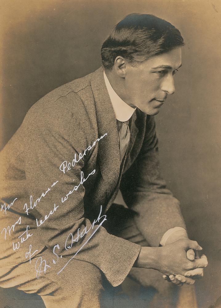 Sharp matte-finish 5.5 x 7.5 portrait of Hart in a pensive pose, signed and inscribed in white ink, "For Mrs. Florence Pederson, with best wishes of W. S. Hart." In fine condition.