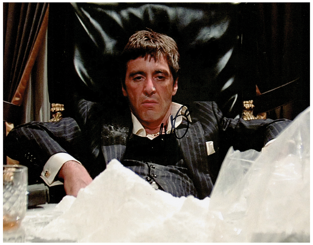 Color satin-finish 14 x 11 photo of Al Pacino as drug czar Tony Montana in the 1983 crime film Scarface, signed in black felt tip. In fine condition.