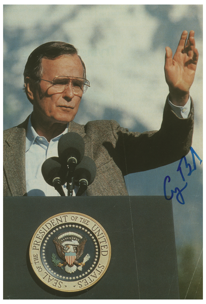 Color glossy 7.5 x 11 photo of President George Bush speaking from behind a podium, signed in blue felt tip. In fine condition.