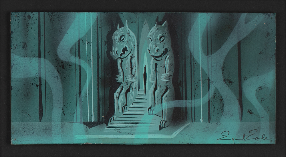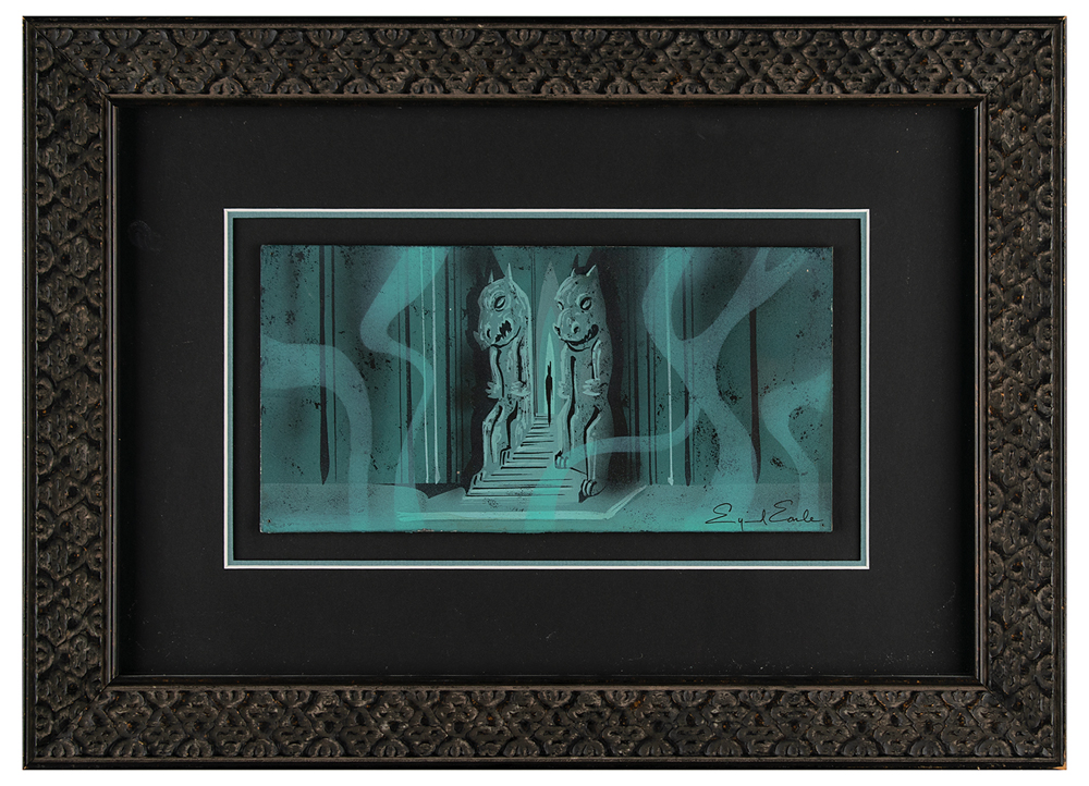 (Walt Disney Studios, 1959) Original concept painting by Eyvind Earle for Sleeping Beauty, portraying the shadowy form of sorceress Maleficent inside her castle in the Forbidden Mountains. As is the case with all Earle concept art, the scene is vividly realized and presented with an impressive eye for both scope and detail. Here Earle restricts himself to muted colors of gray and black and softened teal to capture the spacious inner sanctum of Maleficent. To match its foreboding aura, the scene delivers a strong sense of verticality, with the high walls, immense stone sentries, and rising wisps of smoke essentially forcing focus to center and the long black silhouette of the sorceress. Accomplished in gouache on 10 x 5 artist's board, with Earle signing in black paint in the lower right corner. Attractively mounted and framed to an overall size of 18 x 13. In fine condition, with tack holes to corners. Disney artist Eyvind Earle was Sleeping Beauty's production designer, and Disney gave him a significant amount of freedom in designing the settings and selecting colors for the film. Earle also painted the majority of the backgrounds himself, and his stylistic influence is readily apparent in the final product.