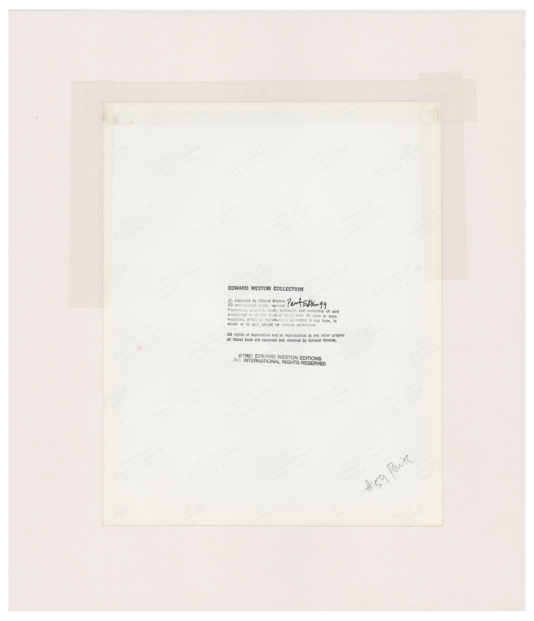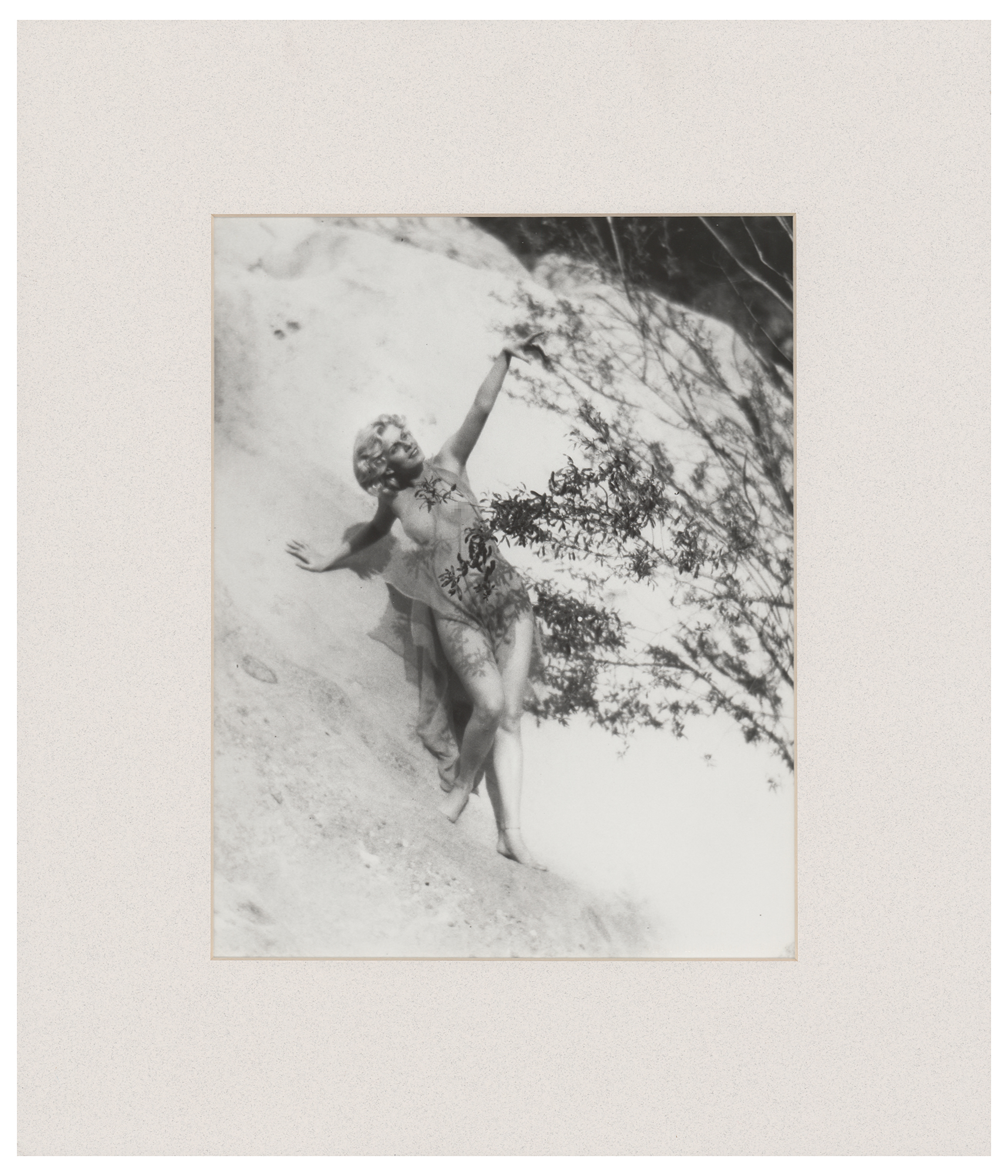 Original glossy 8 x 10 silver gelatin photograph of Jean Harlow taken by Edwin Bower Hesser circa 1929 and printed circa 1981, showing her in a semi-nude frontal pose in Griffith Park, leaning against a cliffside with one arm up. Blindstamped "Edwin Bower Hesser / Edward Weston Collection" in the lower right, with 1981 Edward Weston copyright stamps on the reverse, annotated "Proof Edition 99." Matted to an overall size of 12.25 x 14.25. In very fine condition.