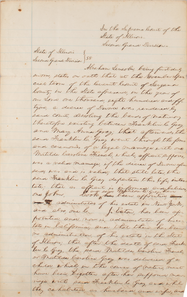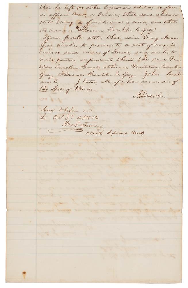 ADS, signed in the third-person, "Abraham Lincoln," and at the conclusion, “A. Lincoln,” one page both sides, 7.75 x 12, October 3, 1856. Lengthy handwritten affidavit by Lincoln, filed with the "Supreme Court of the State of Illinois, Second Grand Division," concerning the disposition of a contested estate. In part: "Abraham Lincoln, being first duly sworn, states on oath that at the November special term of the Circuit Court of Sangamon County, in the State aforesaid, in the year of our Lord one thousand, eight hundred and fifty one, a decree of Divorce was rendered by said court, dissolving the bands of matrimony theretofore existing between Franklin C. Gray and Mary Anna Gray; that afterwards the said Franklin C. Gray went through the forms and ceremonies of a legal marriage with one Matilda Caroline French?after the death of said Franklin C. Gray, the said Matilda Caroline French was delivered of a child, which in the course of nature, must have been begotten after her supposed marriage with Franklin C. Gray, and while they co-habitated, as husband and wife, and that he left no other legitimate child, so far as affiant knows, or believes; that said child is still living, a female and a minor, and that its name is 'Florence Franklin C. Gray.'" Nicely signed at the conclusion by Lincoln, and countersigned by clerk William Turney. Matted and framed with acrylic on both sides to an overall size of 15.5 x 21. In fine condition.