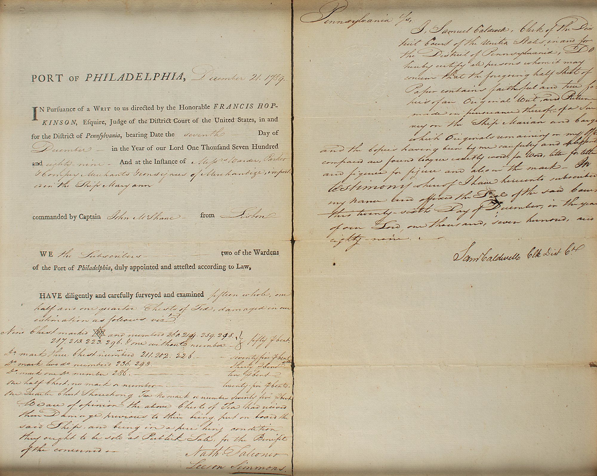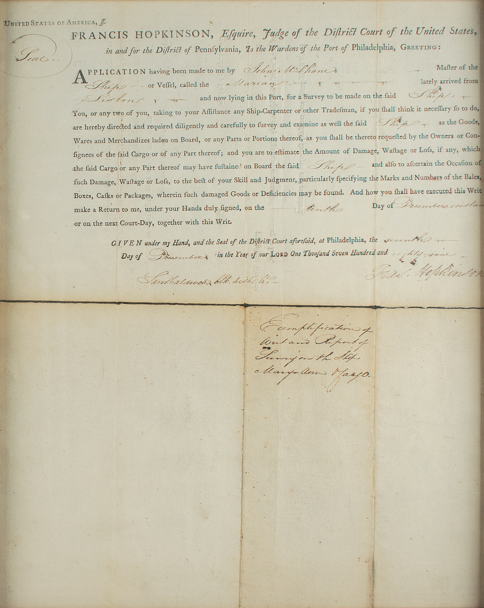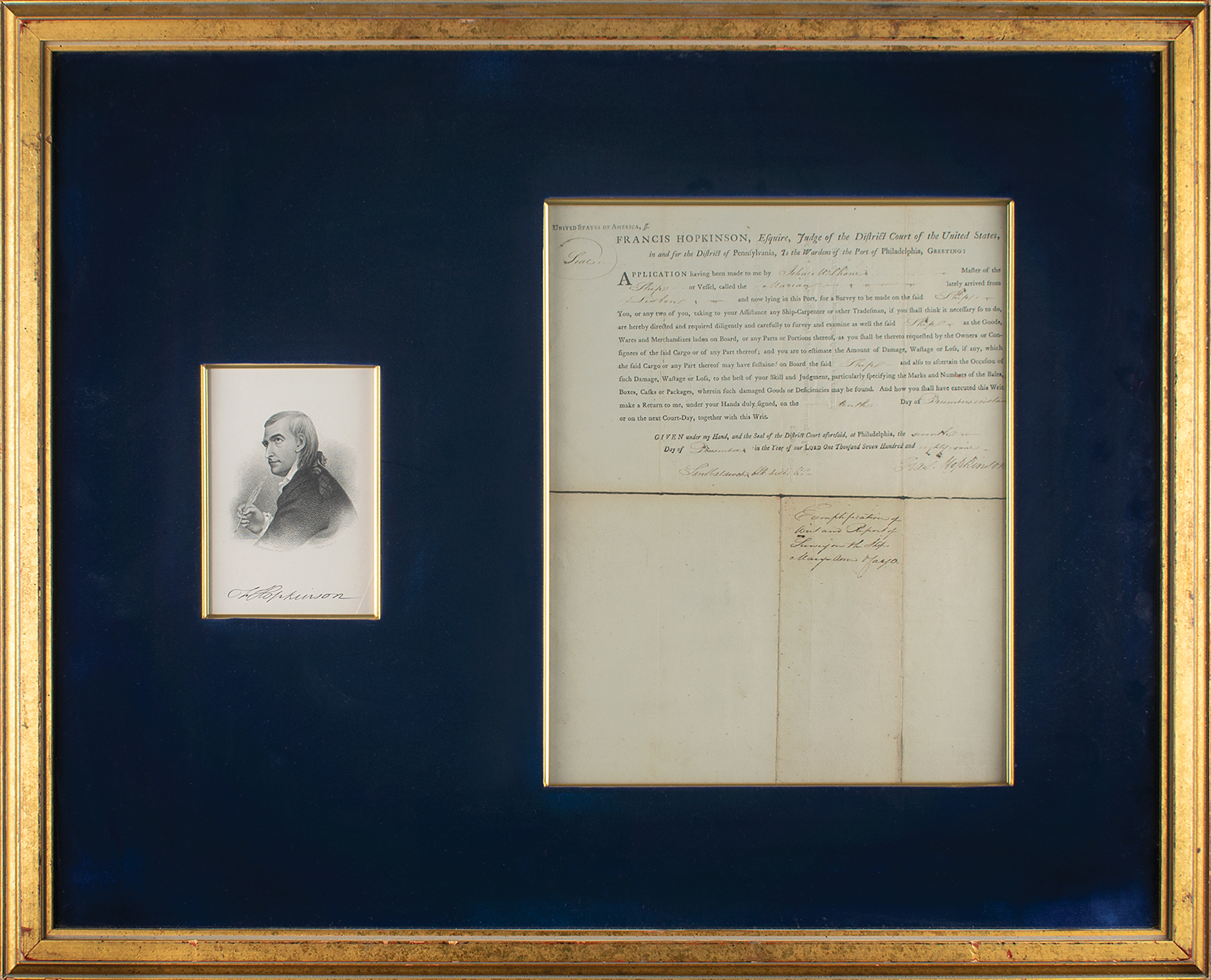 Signer of the Declaration of Independence from New Jersey (1737-1791) who is also known as the designer of the first official American flag. Partly-printed DS, signed “Fras. Hopkinson,” one page, 12 x 15, December 7, 1789. Order issued to the wardens of the port of Philadelphia, in part: "Application having been made to me by John McShane, Master of the Ship or Vessel, called the Marian lately arrived from Lisbon and now lying in the Port, for a Survey to be made on the said Ship, You, or any two of you, taking your assistance any Ship-Carpenter or other Tradesman, if you shall think it necessary to do so, are hereby directed and required diligently and carefully to survey and examine as well the said Ship." Signed at the conclusion by Hopkinson as judge of the District Court of the United States for Pennsylvania. The survey is recorded on the reverse, noting damage to fifteen chests of tea. Impressively matted and framed alongside an engraved portrait (bearing a facsimile signature) to an overall size of 32 x 26.5, with a window in the backing for viewing the reverse. In fine condition.