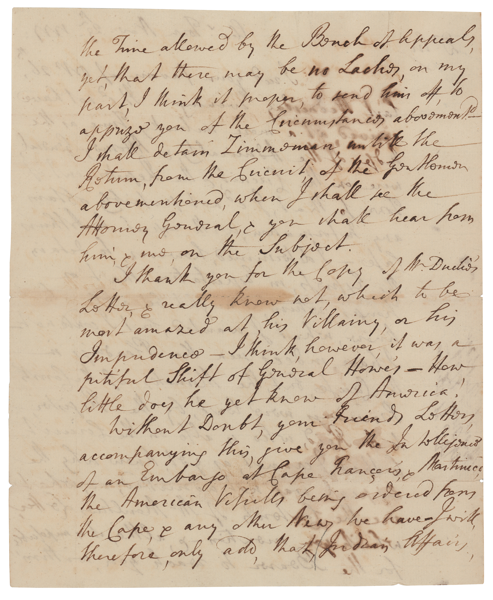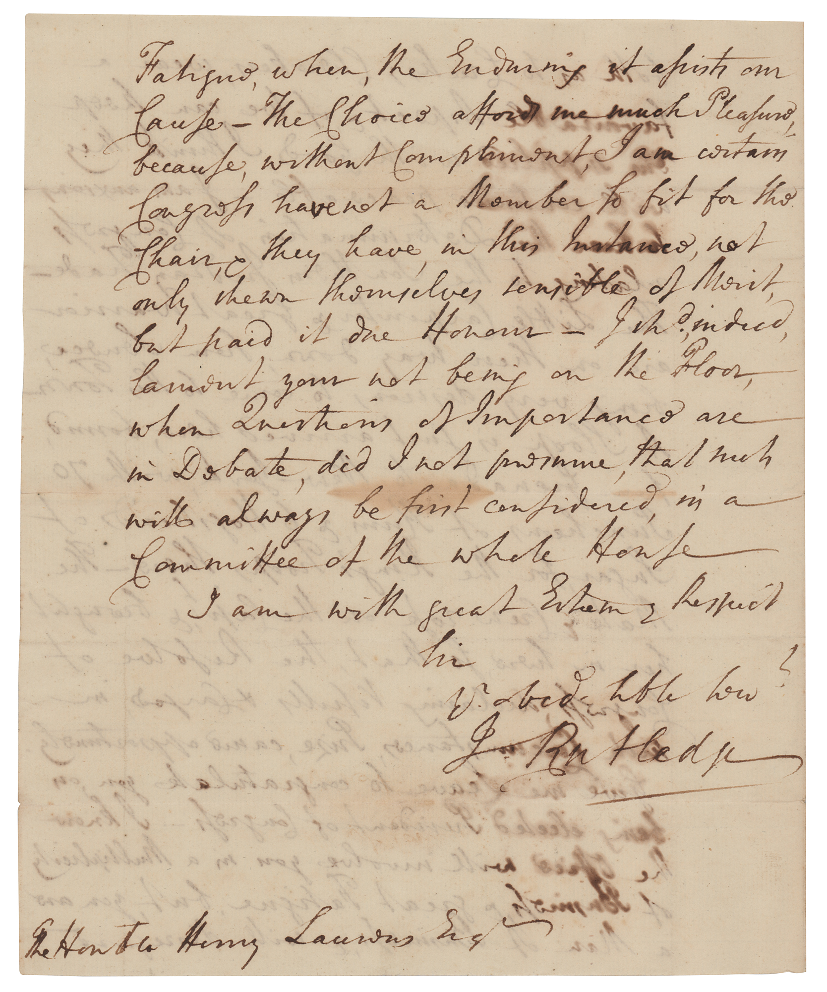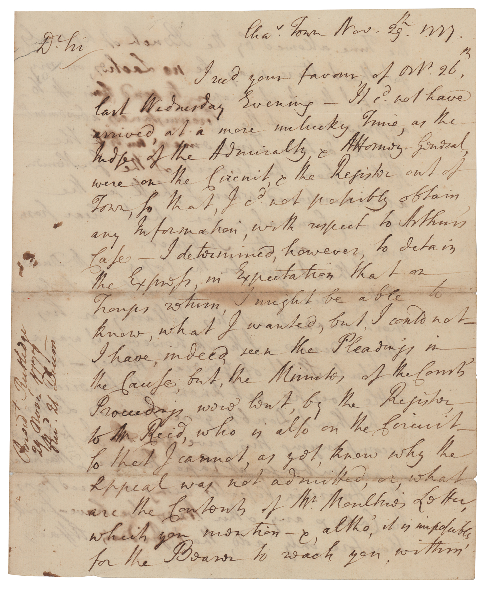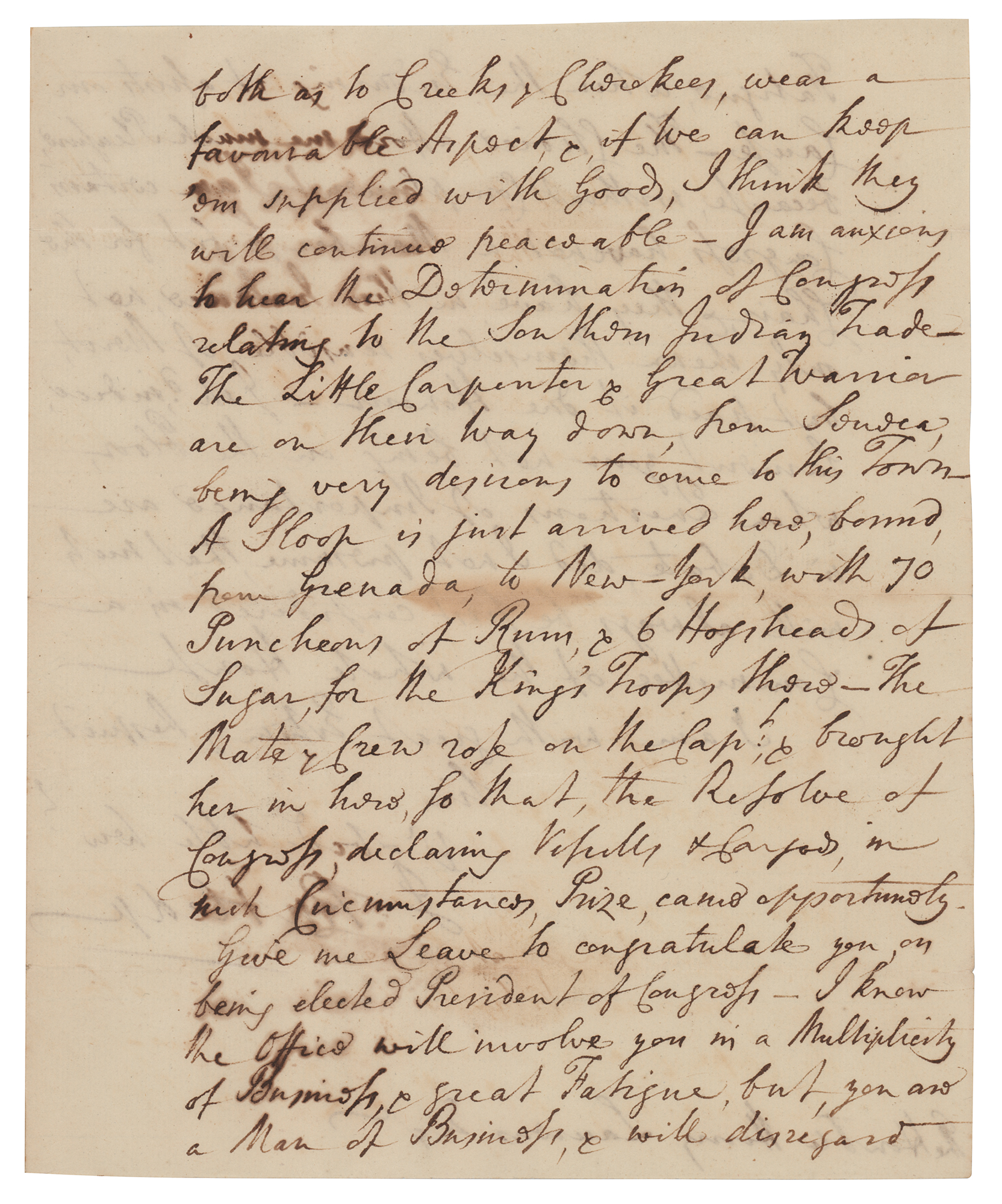 Statesman (1739-1800), who served as the first governor of South Carolina following the signing of the United States Constitution, and was the second chief justice of the Supreme Court. Significant Revolutionary War-dated ALS signed “J. Rutledge,” four pages on two adjoining sheets, 7.5 x 9, November 29, 1777. Letter to newly elected president of the Continental Congress, Henry Laurens, providing details of a legal matter, news of the Revolution, dealings with Native American Indians, and congratulating him on his new position. In part: "I cannot as yet know why the appeal was not admitted, or, what are the contents of Mr. Moultries Letter…I thank you for the copy of Mr. Dudlie's letter & really know not which to be most amazed at, his Villainy, or his Independence.—I think however, it was a pitiful shift of General Howe's—How little does he yet know of America! Without Doubt, your Friends Letters…give you the Intelligence of an Embargo at Cape Tancers and Martinique, the American Vessels being ordered from the Cape, & any other News we have—I will therefore, only add, that Indian Affairs both as to Creeks & Cherokees, wear a favorable Aspect, & if we can keep 'em supplied with Goods, I think they will continue peaceable. I am anxious to hear the Determination of Congress relating to the Southern Indian Trade—The Little Carpenter & Great Warrior are on their Way down, from Sondea, being very desirous to come into this Town. A Sloop is just arriving here, bound from Grenada to New York with 70 Puncheons of Rum & 6 Hogsheads of Sugar, for the King's Troops here. The Mate & Crew rose on the Captn, & brought her in here, so that The Resolve of Congress, declaring Vessels & Cargoes, in such Circumstances, Prize, came opportunely. Give me Leave to congratulate you, on being elected President of Congress—I know the Office will involve you in a Multiplicity of Business & great Fatigue, but, you are a Man of Business, & will disregard Fatigue, when the Enduring it assists our Cause—The Choice affords me much Pleasure, because, without compliment, I am certain Congress have not a Member so fit for the Chair, & they have, in this Instance, not only shewn themselves sensible of Merit, but paid it due Honour. I should indeed lament your not being on the Floor, when Questions of Importance are in Debate, did I not presume, that such will always be first considered, in a committee of the whole House." In very good to fine condition, with some scattered light staining. Accompanied by a custom-made quarter-leather folder.