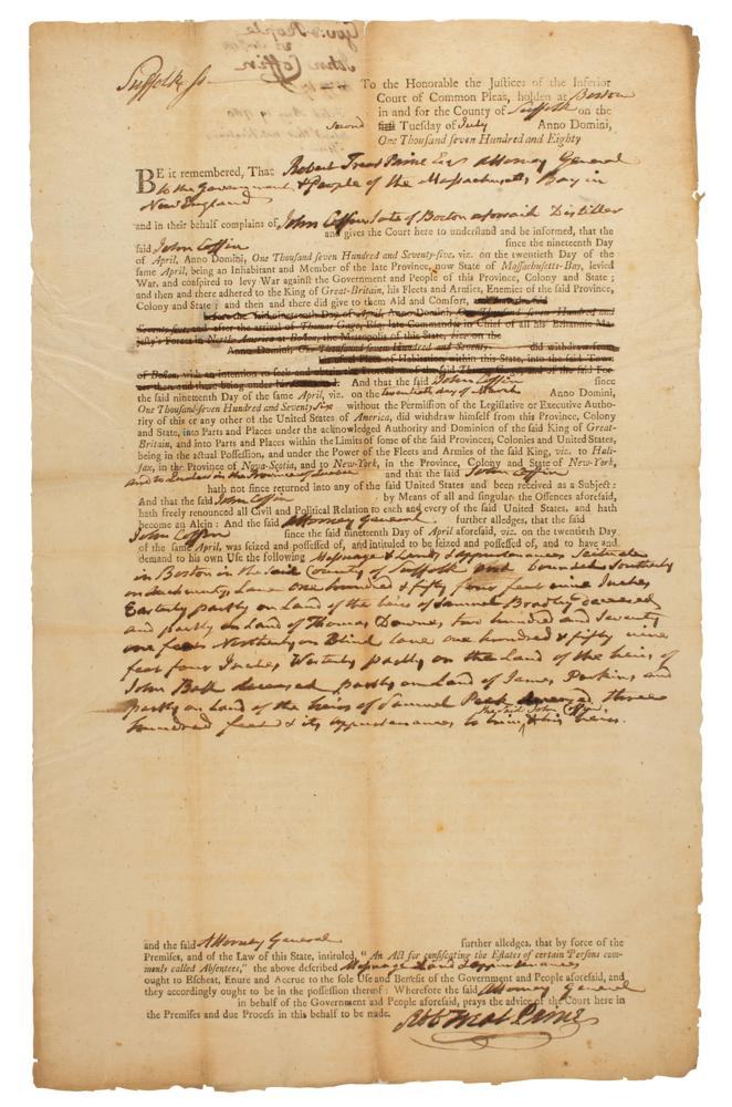 Revolutionary War-dated partly-printed ADS, signed in the third-person, "Robert Treat Paine Esq. Attorney General," and at the conclusion, "Rob. Treat Paine," one page, 10.75 x 17, July 11, 1780. Scarce Massachusetts confiscation document filled out and signed by Paine as attorney general, in part: "Robert Treat Paine Esq. Attorney General to the Government & People of the Massachusetts Bay in New England and in their behalf complains of John Coffin of Boston aforesaid Distiller?that the said John Coffin?levied War, and conspired to levy War against the Government and People of this Province, Colony and State; and then and there adhered to the King of Great-Britain, his Fleets and Armies, Enemies of the said Province, Colony and State; and then and there did give to them Aid and Comfort." At the bottom, Paine writes out a description of Coffin's property in Boston. In very good to fine condition, with light toning along the folds, and a few small repairs on the reverse.