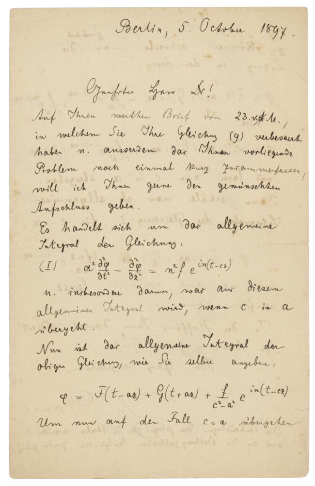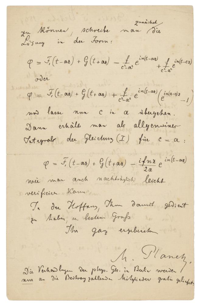 ALS in German, signed “M. Planck,” one page both sides, 5.5 x 8.75, October 5, 1897. Handwritten mathematical letter to Dr. Ludwik Silberstein, discussing the full solution (the "general integral") of a particular differential equation. Well known for his mathematical prowess, Planck obtains the solution, both in general, and in a particular “limiting case” of interest to Silberstein. He adds a postscript (translated): "The proceedings of the Physical Society in Berlin are sent free of charge only to dues-paying members." In very good to fine condition, with a partial split to the central horizontal fold, a few tiny edge tears, and a diagonal crease to one corner.