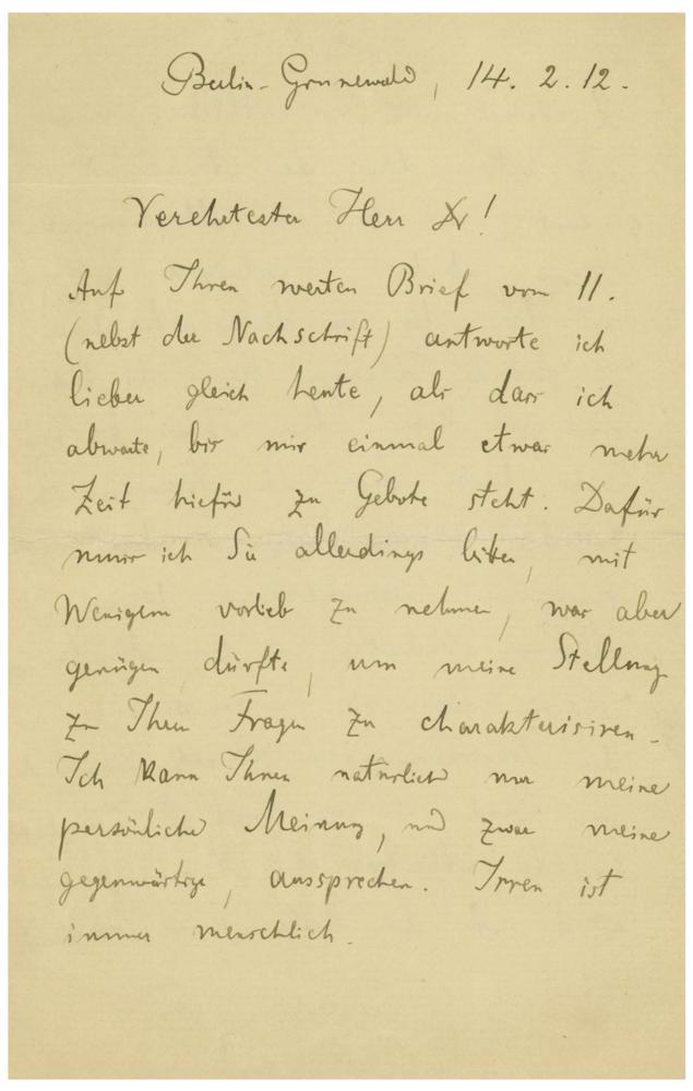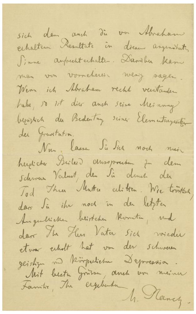 ALS in German, signed “M. Planck,” four pages on two adjoining sheets, 4.5 x 7, February 14, 1912. Handwritten letter to Dr. Ludwik Silberstein, discussing his former Ph.D. student Max Abraham’s 1912 theory of gravitation—a precursor to Einstein’s general theory of relativity, the theory of gravity as spacetime geometry. In part (translated): "I would rather answer your valued letter (along with the postscript) of the 11th right away today than wait until at some point I have somewhat more time at my disposal to do so. However, I have to ask you in exchange to make do with a little, which should nonetheless be enough to characterize my position in relation to your question. Naturally, I can only give you my personal opinion, and indeed my current one. To err is always human.