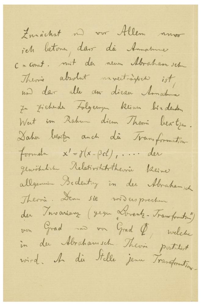 First and above all, I have to emphasize that the assumption c = constant is absolutely incompatible with the new Abraham theory, and that all consequences to be drawn from this assumption have no binding value within the framework of this theory. The transformation formulas x'=γ(x-βct),....of the usual theory of relativity therefore also have no general significance in the Abraham theory. They contradict invariance (with respect to 'Lorentz transformation') of degree and of degree Φ, which is postulated in the Abraham theory. The place of those transformation formulas, therefore, must be taken by other, more general ones, perhaps dx'=γ(dx-βcdt),...From a general perspective, therefore, Abraham’s conclusions cannot be maintained in connection with the elementary law of gravitation.