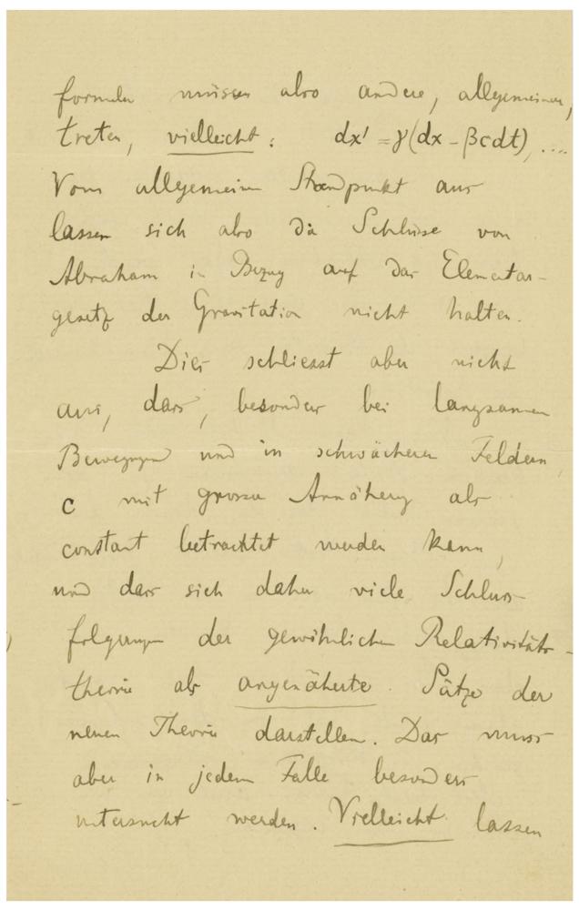 However, this does not exclude the possibility that, especially in the case of slow movements and in weak fields, c can be considered as constant to a high degree of approximation, and consequently that many conclusions of the usual theory of relativity appear as approximate theorems of the new theory. This must nevertheless be specially investigated in every case. Perhaps the results obtained by Abraham can then also be upheld in this approximated sense. Little can be said about this in advance. If I have understood Abraham correctly, this is also his opinion with regard to the significance of his elementary law of gravitation.