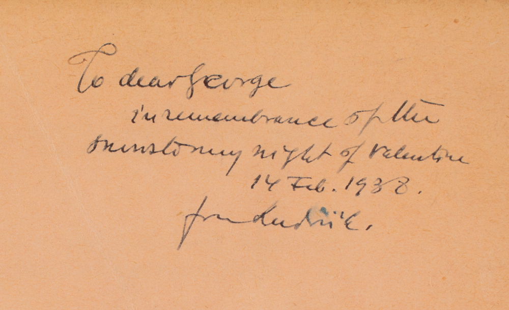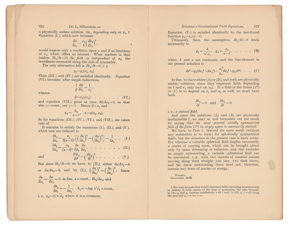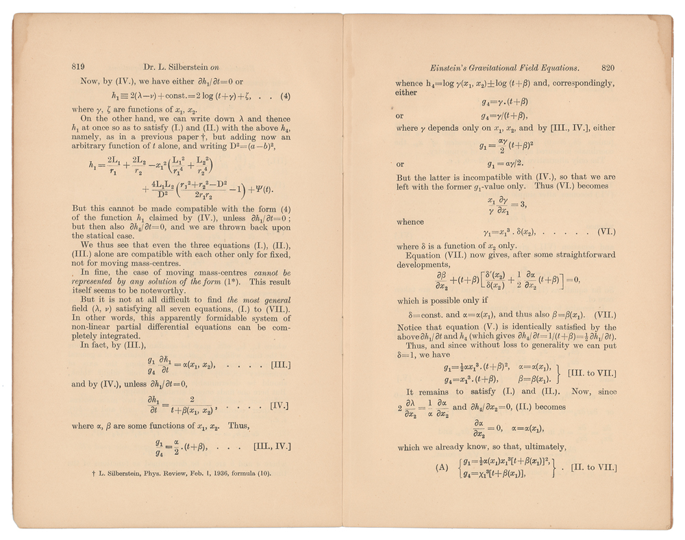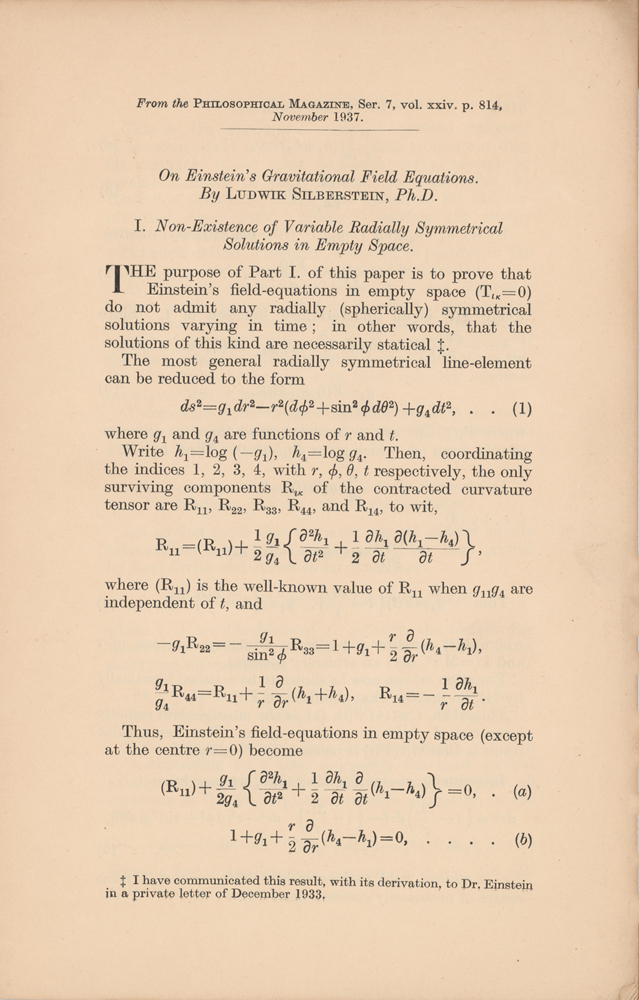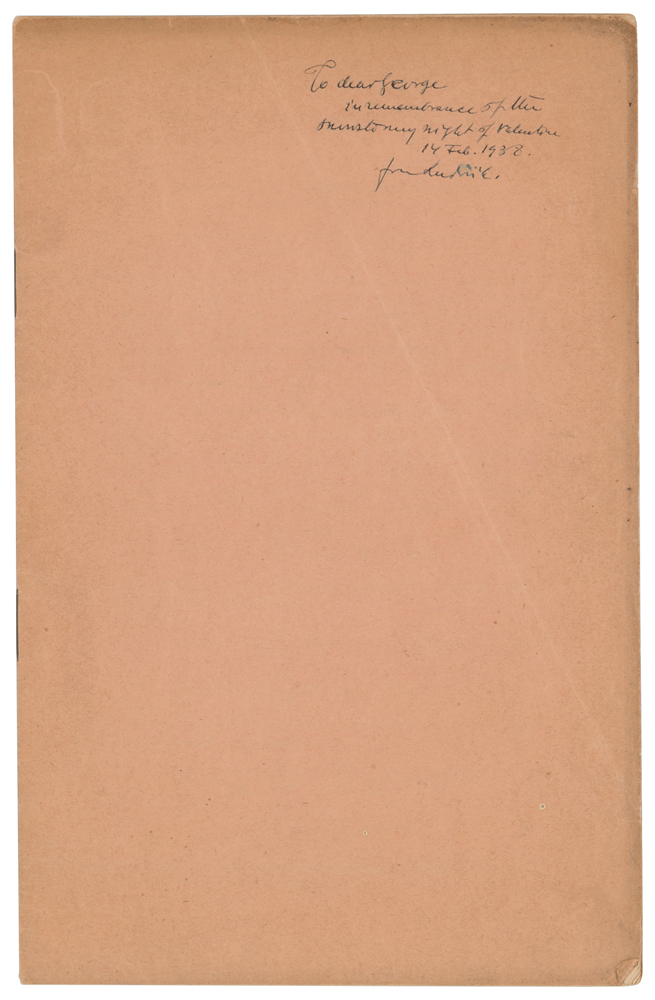 Offprint booklet of Silberstein's paper 'On Einstein's Gravitational Field Equations,' from the Philosophical Magazine (November 1937), 5.5 x 8.5, ten pages, signed and inscribed on the front wrapper in fountain pen to his son, "To dear George, in remembrance of the snowstormy night of Valentine, 14 Feb. 1938, from Ludwik." The paper begins: "The purpose of Part I. of this paper is to prove that Einstein's field-equations in empty space (Tik=0) do not admit any radially (spherically) symmetrical solutions varying in time; in other words, that the solutions of this kind are necessarily statical." A footnote states: "I have communicated this result, with its derivation, to Dr. Einstein in a private letter of December 1933." In fine condition, with minor creases to wrappers, and pencil annotations to rear wrapper. From the collection of physicist Ludwik Siberstein.