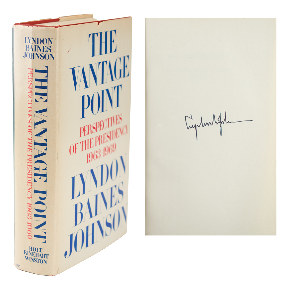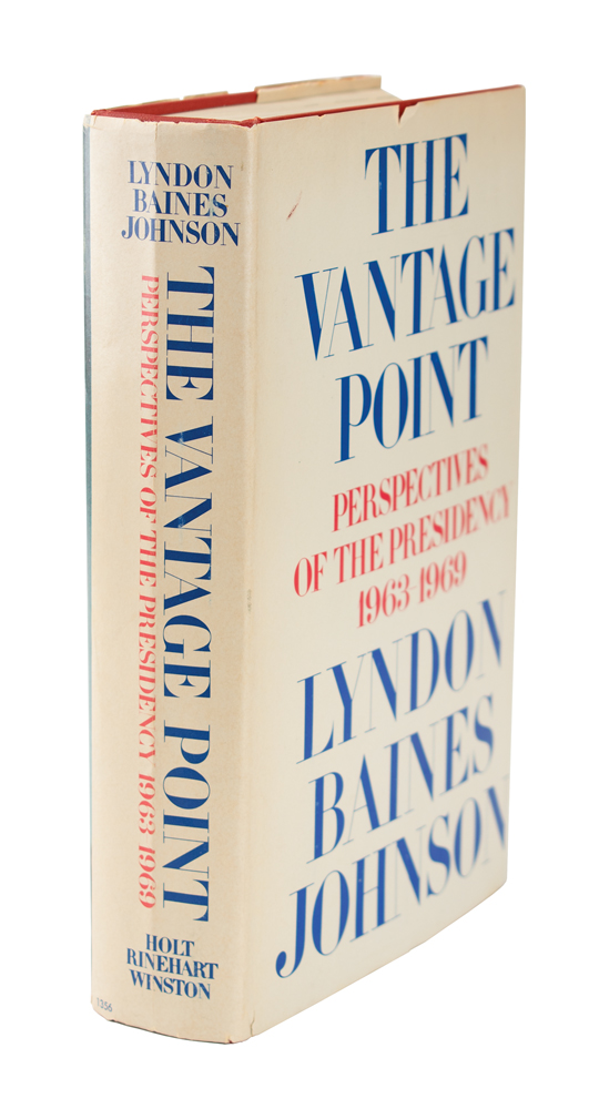 Signed book: The Vantage Point: Perspectives of the Presidency, 1963-1969. First edition. NY: Holt, Rinehart and Winston, 1971. Hardcover with dust jacket, 6.5 x 9.5, 636 pages. Signed on the first free end page in fountain pen by Lyndon B. Johnson. In fine condition, with toning, creasing, and short edge tears, only to the dust jacket.