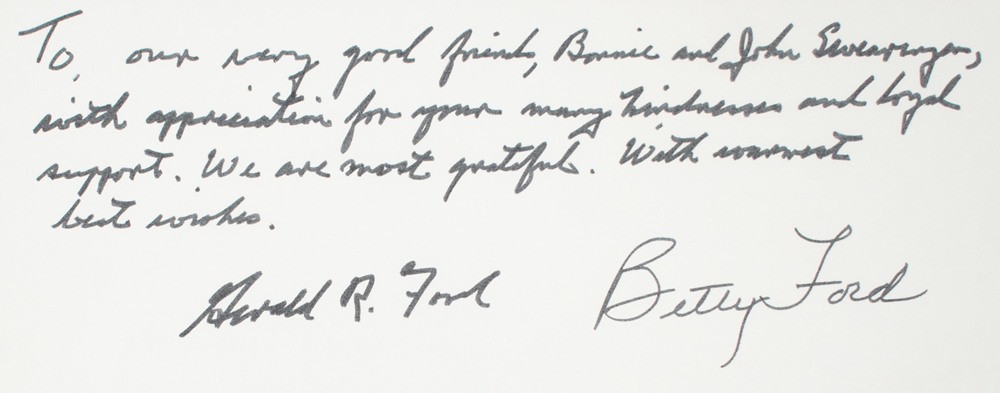 Color satin-finish 7.25 x 7.25 photo of the Fords affixed to its original 10.75 x 13.75 mount, signed and inscribed on the mount in black felt tip, "To our very good friends, Bonnie and John Swearingen, with appreciation for your many kindnesses and loyal support. We are most grateful. With warmest best wishes, Gerald R. Ford" and "Betty Ford.” In very fine condition. As CEO of Standard Oil, John Swearingen was the most powerful oil executive of his generation; his wife Bonnie was a socialite and philanthropist.