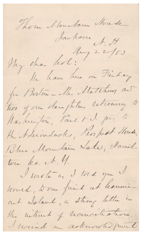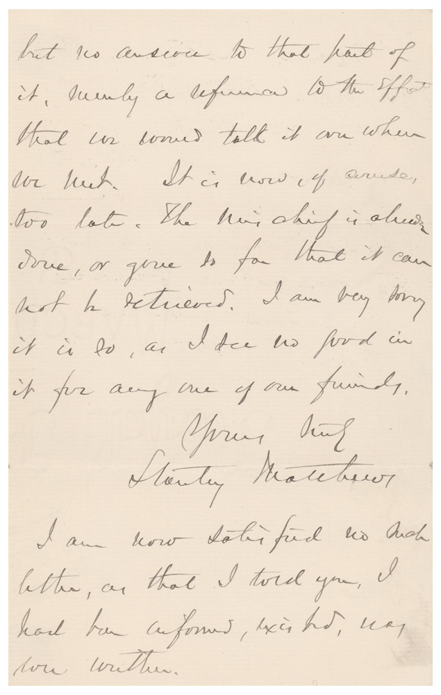American attorney, soldier, judge and Republican senator from Ohio (1824-1889) who became an Associate Justice of the United States Supreme Court, serving from May 1881 to his death. ALS, three pages on two adjoining sheets, 5 x 8, August 22, 1883. Handwritten letter to his old friend, Colonel C. W. Woolley. In part: "We leave here on Friday for Boston—Mrs. Matthews and two of our daughters returning to Washington, Paul & I going to the Adirondacks, Prospect House, Blue Mountain Lake, Hamilton Co., N. Y." He states that he wrote to a mutual friend in the interest of reconciliation, but received no answer to the question. He concludes: "It is now, of course, too late. The mischief is already done, or gone so far that it can not be retrieved. I am very sorry it is so, as I see no good in it." A handwritten note, evidently by Woolley, is written on the facing page. In fine condition.