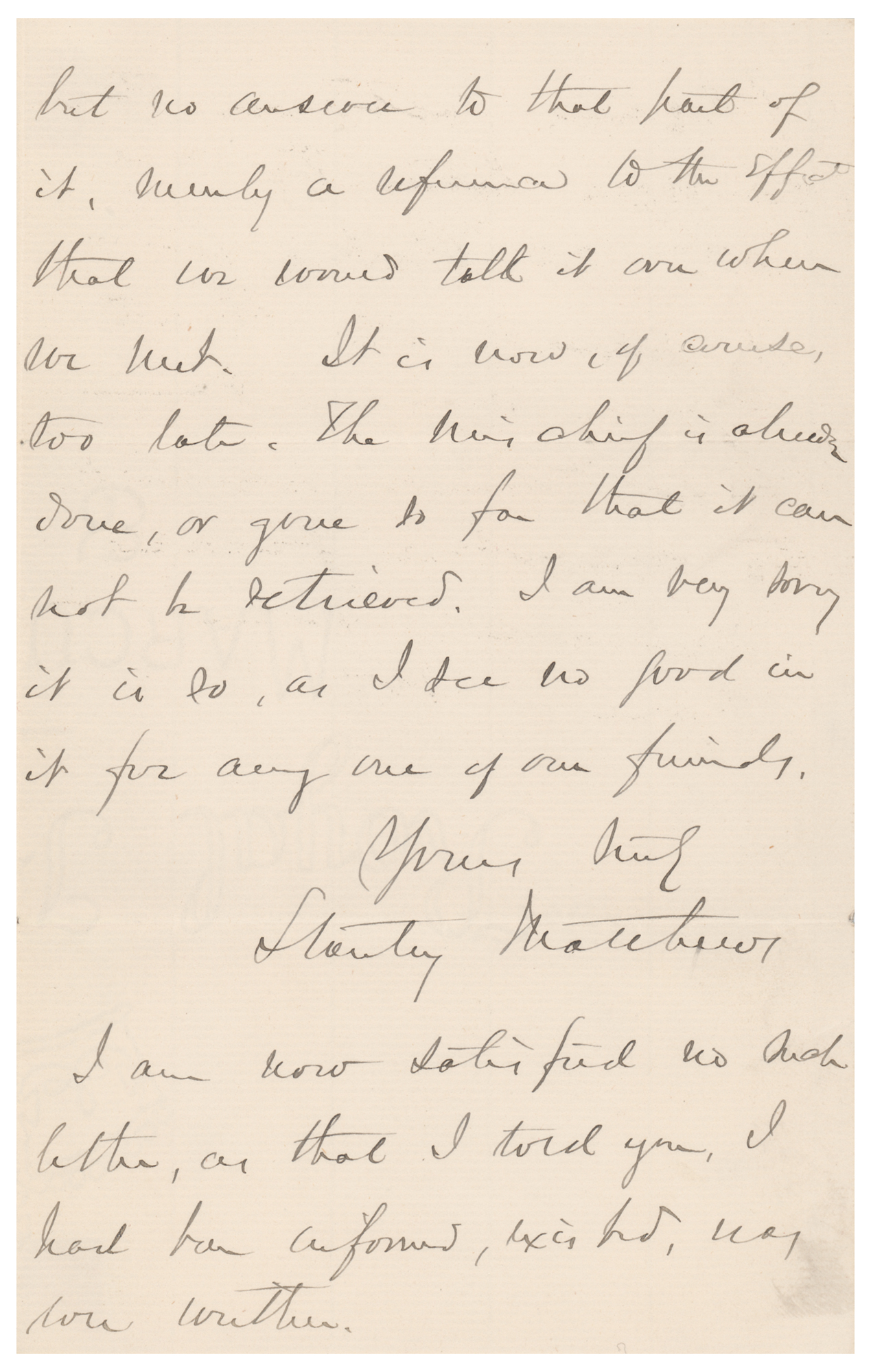 American attorney, soldier, judge and Republican senator from Ohio (1824–1889) who became an Associate Justice of the United States Supreme Court, serving from May 1881 to his death. ALS, three pages on two adjoining sheets, 5 x 8, August 22, 1883. Handwritten letter to his old friend, Colonel C. W. Woolley. In part: "We leave here on Friday for Boston—Mrs. Matthews and two of our daughters returning to Washington, Paul & I going to the Adirondacks, Prospect House, Blue Mountain Lake, Hamilton Co., N. Y." He states that he wrote to a mutual friend in the interest of reconciliation, but received no answer to the question. He concludes: "It is now, of course, too late. The mischief is already done, or gone so far that it can not be retrieved. I am very sorry it is so, as I see no good in it." A handwritten note, evidently by Woolley, is written on the facing page. In fine condition.
