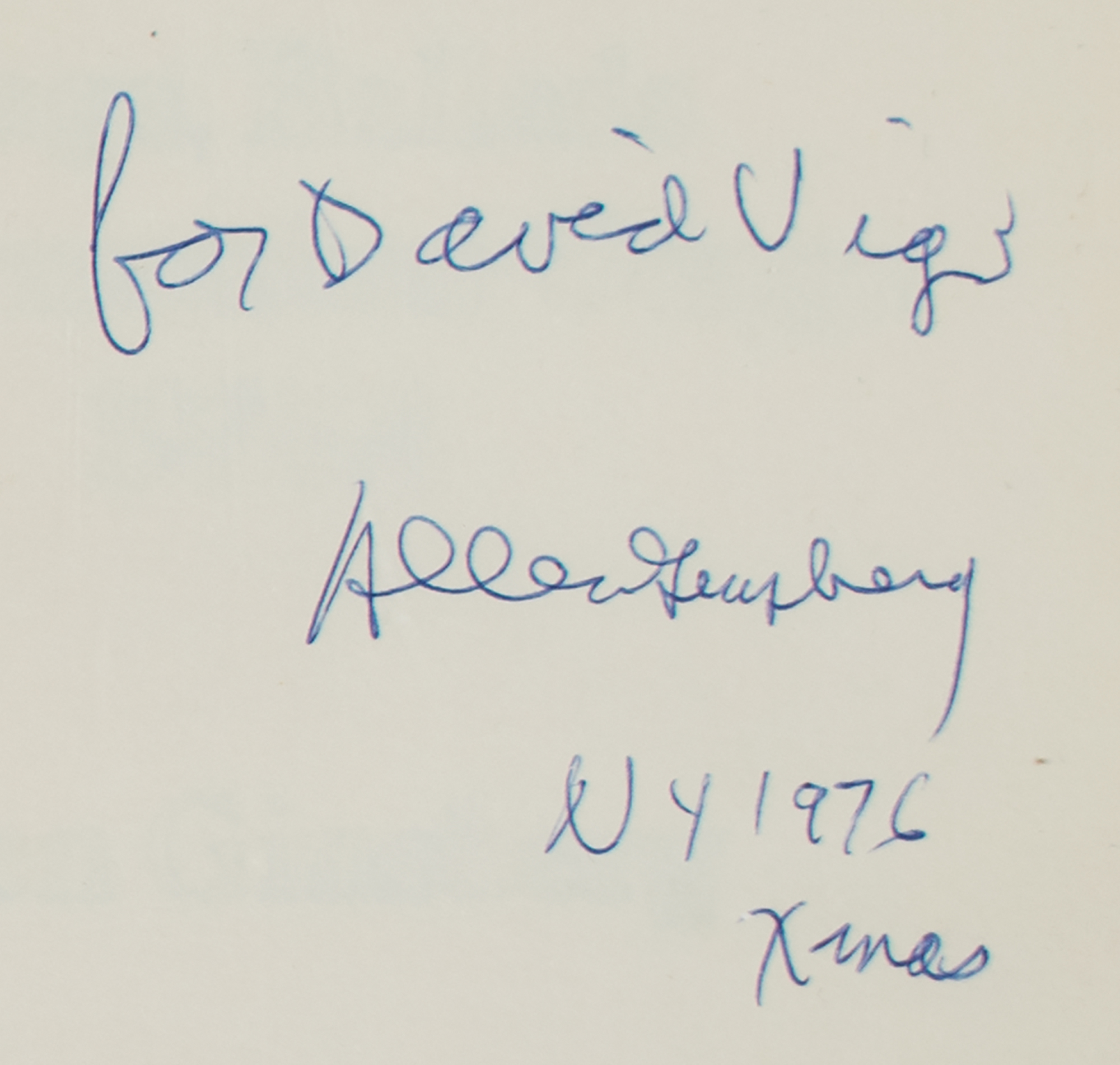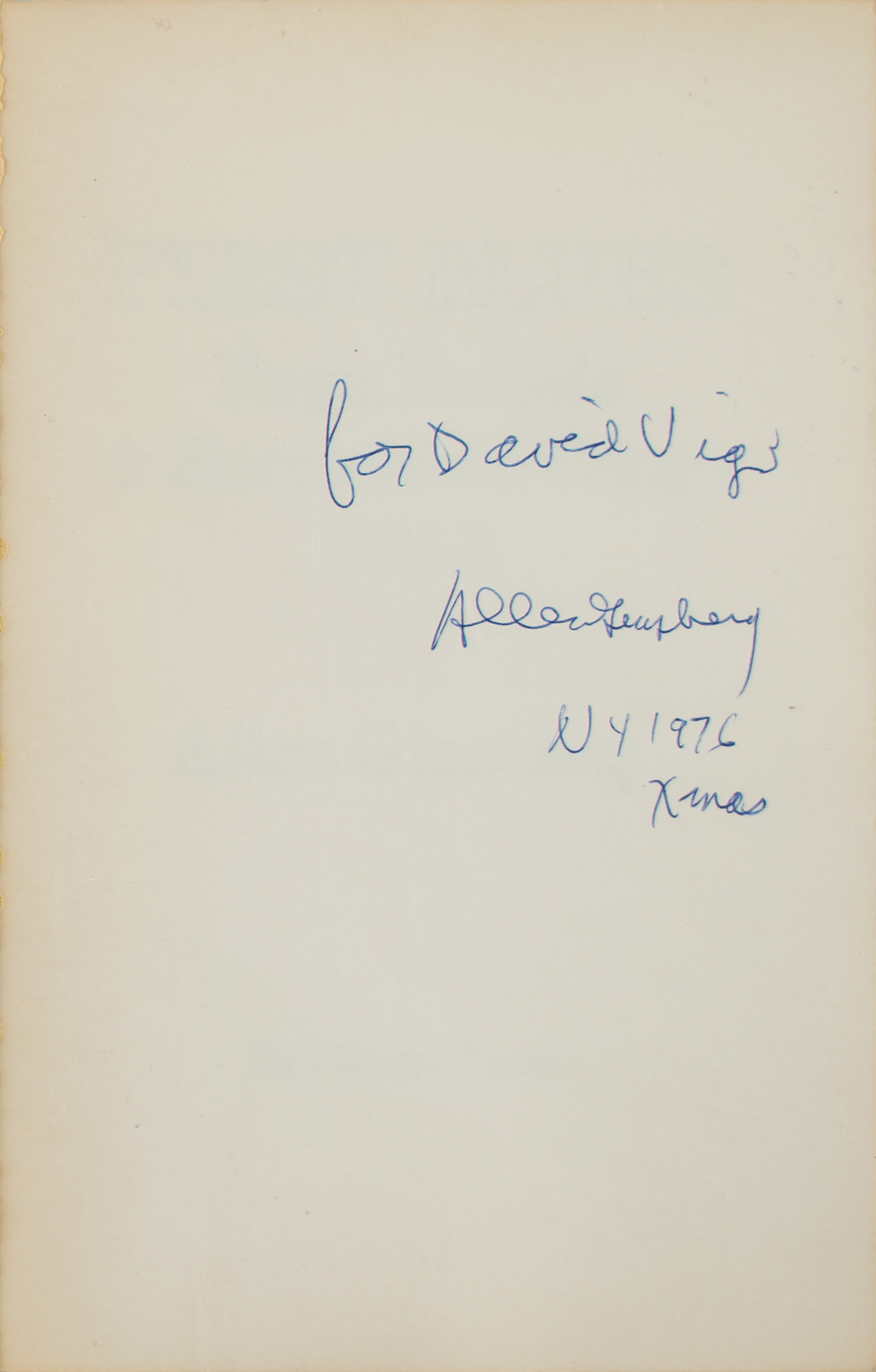 Signed book: First Blues: Rags, Ballads & Harmonium Songs, 1971–74. First edition. NY: Full Court Press, 1975. Signed and inscribed on the first free end page in blue ballpoint, "For David Vig, Allen Ginsberg, NY 1976, Xmas." In fine condition.