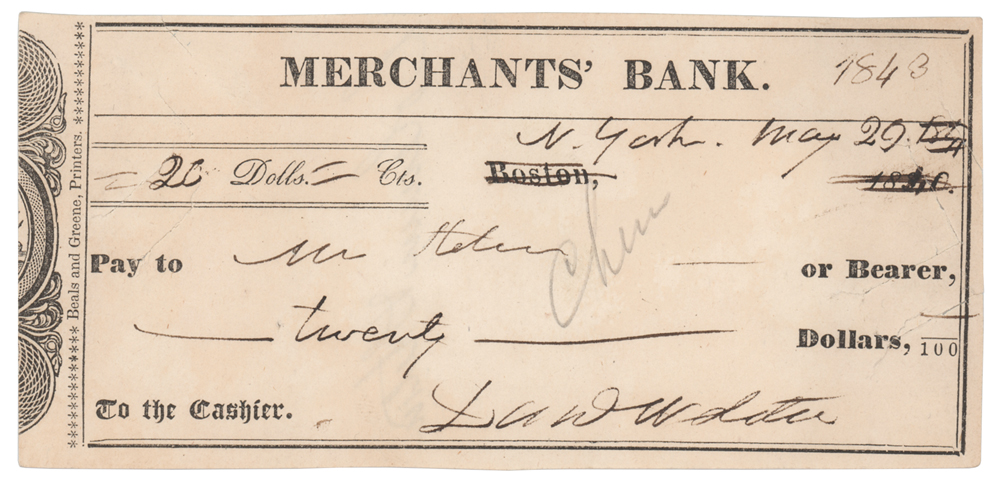 Merchants' Bank check, 5.25 x 2.5, filled out and signed by Daniel Webster, "Dan' Webster," for $20, May 29, 1843. In fine condition. Accompanied by a vintage reprint photo of Webster.