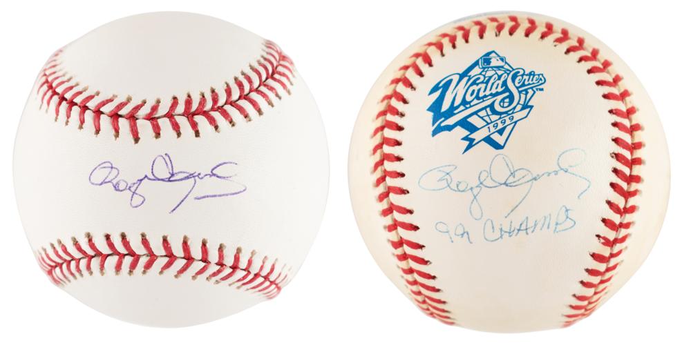 Two official Rawlings Major League (Selig) baseballs: a 1999 World Series baseball, signed on a side panel in blue ballpoint, "Roger Clemens, 99 Champs"; and a baseball signed on the sweet spot in blue ballpoint, "Roger Clemens." In overall fine condition, with light toning to the World Series baseball, and Steiner and Mounted Memories holograms affixed to the other ball. Clemens won the deciding Game 4 in the Yankees' 1999 World Series sweep of the Atlanta Braves, surrendering just one run over 7.2 innings pitched.