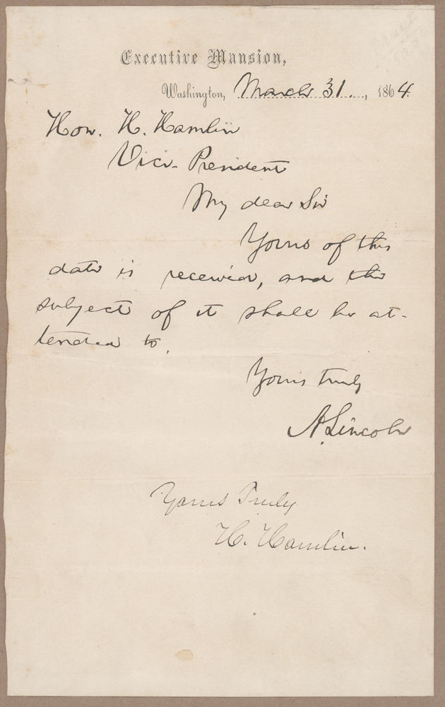 Civil War-dated ALS as president signed “A. Lincoln,” one page, 5 x 8, Executive Mansion letterhead, March 31, 1864. Short letter to Vice President Hannibal Hamlin, in full: "Yours of this date is received, and the subject of it shall be attended to." The letter is affixed inside a presentation folder. In very good to fine condition, with lightly trimmed edges, soft creasing, and some small faint stains.