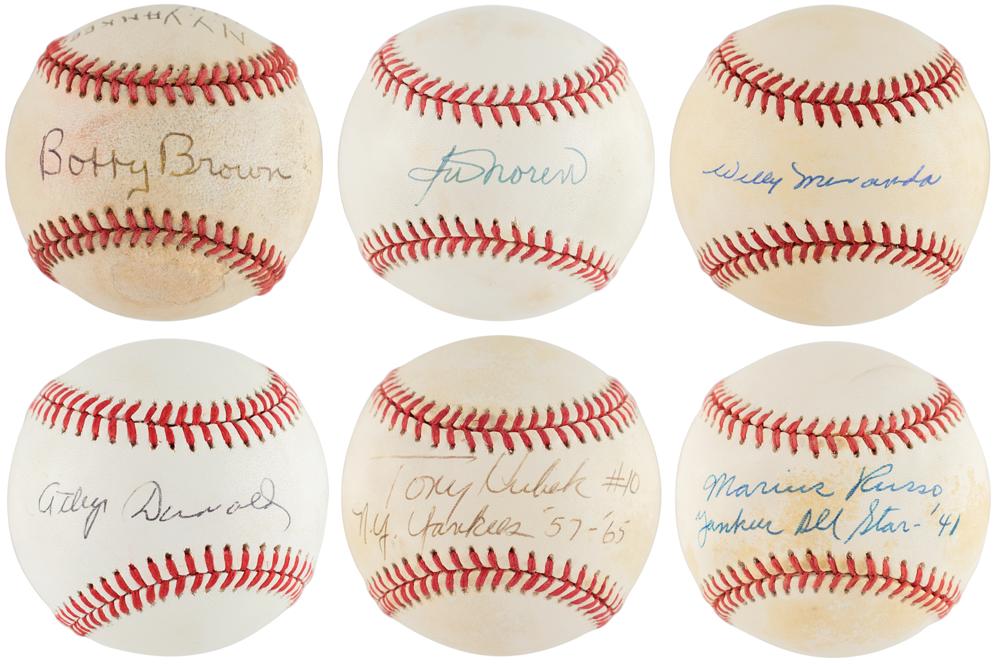 Six official Rawlings American League baseballs, each signed in ballpoint by a New York Yankees player from the mid-century squads of the 1940s and 1950s. Signers are: Bobby Brown ("N.Y. Yankees 1946-54, A.L. Pres. 1984-94"), Irv Noren, Willy Miranda, Atley Donald, Marius Russo ("Yankees All Star - 1941"), and Tony Kubek ("#10, N.Y. Yankees '57-'65"). In very good to fine condition, with some scattered toning and soiling.