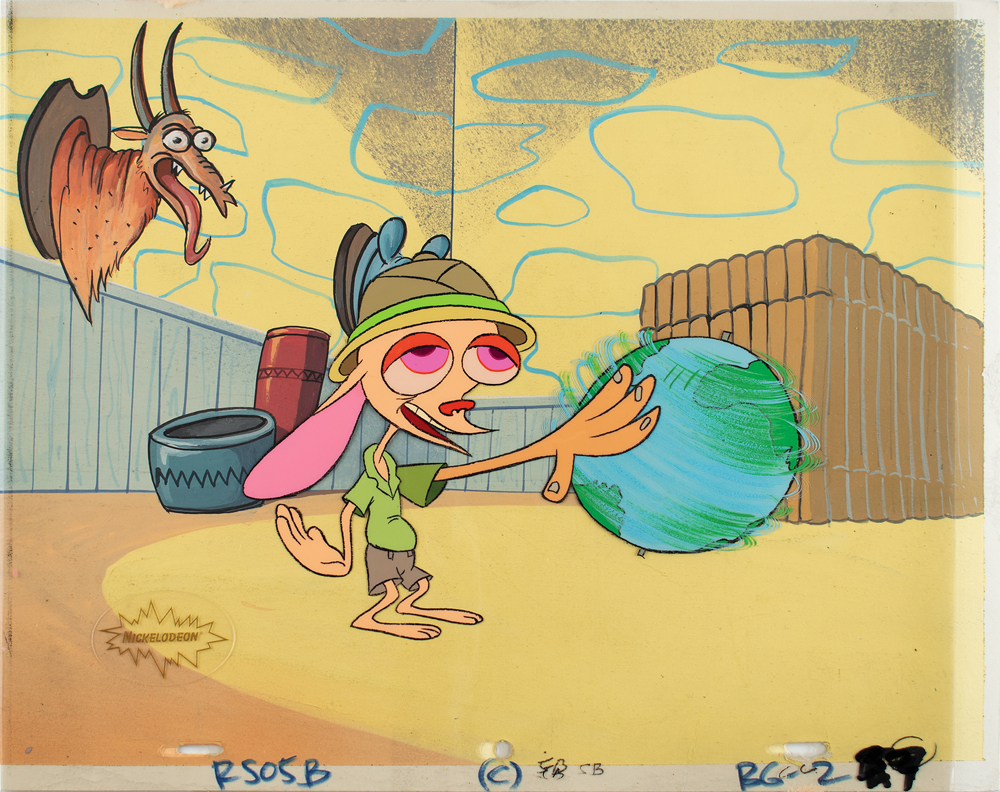 (Spumco, 1991) Superb original production cels and production background featuring Ren from Untamed World: A Cartoon, the 10th episode of Season 1 of The Ren & Stimpy Show, which originally aired on November 10, 1991. The scene shows Ren as explorer Marland Höek, spinning a globe in his study with the back wall lined with mounted animal heads. The cels are placed on a fantastic hand-painted production background from the same film. Total character image (Ren and globe) measures 7.25 x 5.25, with overall dimensions of 13.25 x 10.5. The piece has the Nickelodeon seal to lower left. In fine condition. Accompanied by a certificate of authenticity from Nickelodeon.