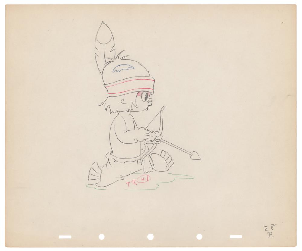 (Walt Disney Studios, 1937) Original production drawing featuring Little Hiawatha from the Silly Symphonies short Little Hiawatha, showing the cute little Native American holding his bow in profile. Accomplished in graphite and colored pencil on untrimmed 12 x 10 animation paper marked "28 R" in the lower right corner. Image measures 4.75 x 7. In fine condition. Accompanied by a certificate of authenticity from Howard Lowery.