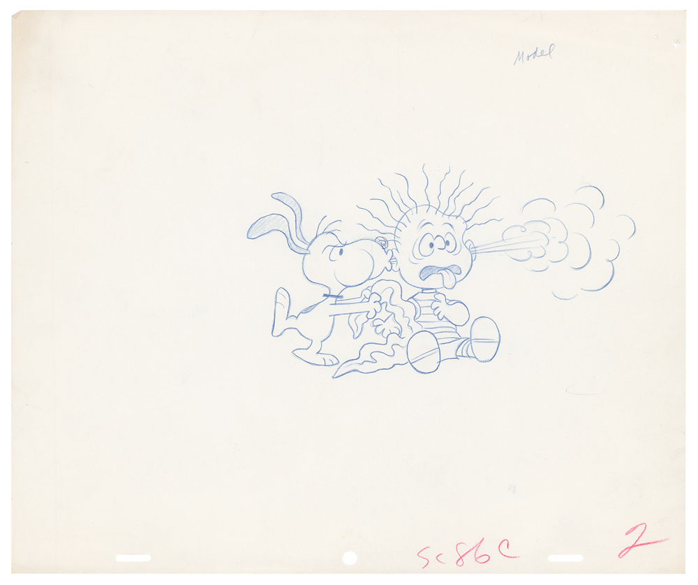 (National General Pictures, 1972) Original production drawing of Snoopy and Linus from the animated musical comedy-drama film Snoopy Come Home, which shows Snoopy getting into a fight with Linus over his blanket. Accomplished in graphite and colored pencil on untrimmed 12.5 x 10.5 animation paper marked along the bottom as "SC86C, 2." Total character image measures 7.25 x 4. In fine condition, with staples holes to upper right corner, and some light creases to top and bottom edges. Accompanied by a certificate of authenticity from Howard Lowery.