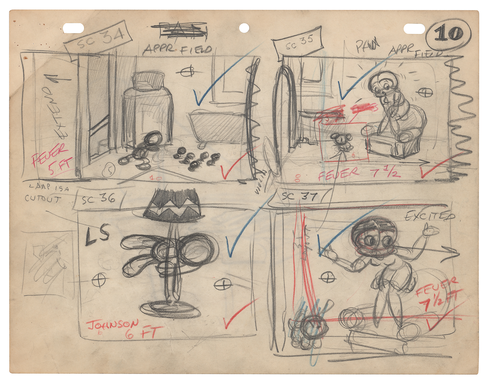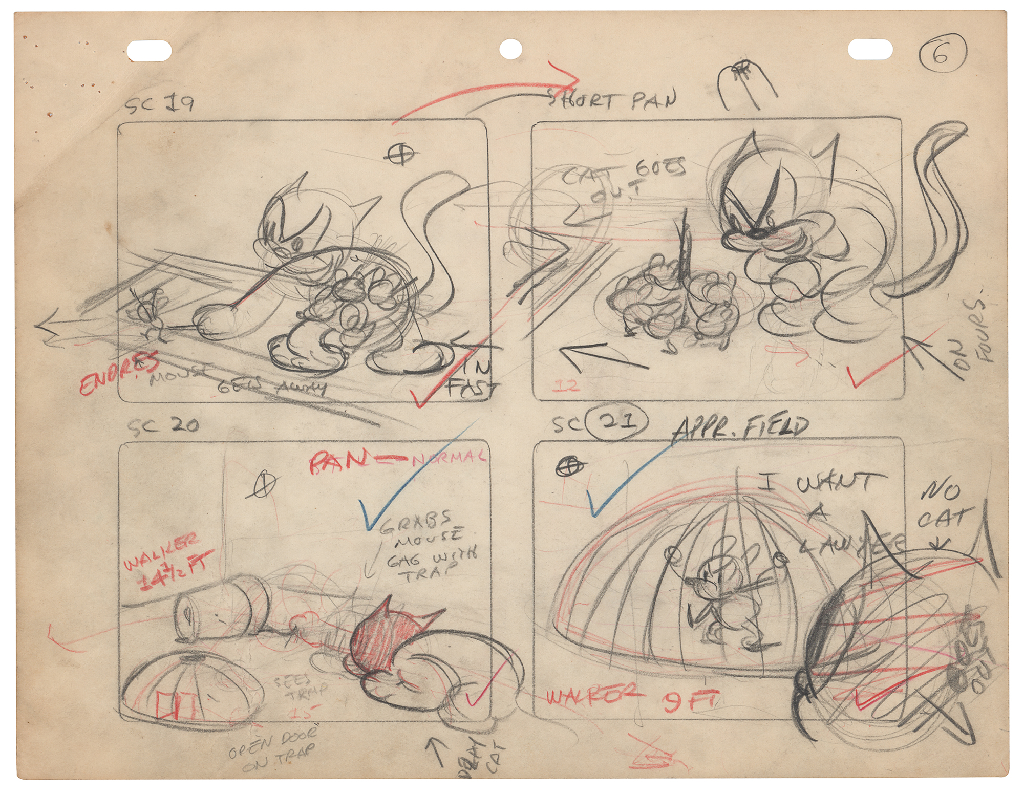 (Fleischer Studios, 1938) Original complete 14-page hand-drawn storyboard for the Betty Boop and Pudgy the Watchman short film Pudgy the Watchman, which was released on August 12, 1938. The storyboard contains 14 pages and a total of 49 drawings, with the majority bearing scene notes and directions. Each storyboard page is accomplished in graphite and colored pencil on untrimmed 11 x 8.5 animation paper; the lone exception being the opening or title page, “BY-12, in Pudgy the Watchman,” with upper border marked “Footage Totals,” “Final Record,” and “Bonus!” The sheet lists the first names of the five cartoonists—“Tom,” “Harold,” “Frank,” “Otto,” and “Tony”—their starting dates, their scenes, and the footage totals. In overall fine condition, with some small tears and scattered creases, and tack holes to the upper corner of each page.
