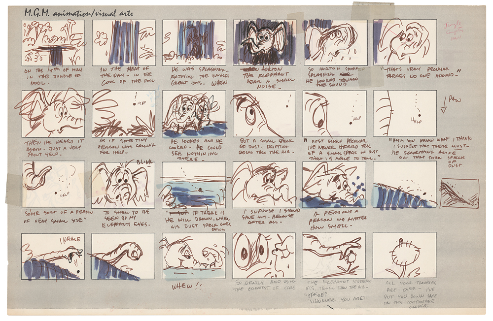 (MGM Studios, 1954) Original partial hand-drawn storyboard for Horton Hears a Who! The one-page storyboard contains a total of 25 drawings for the opening scenes of the film, with the majority bearing lines of narration related to the scene. Two of the storyboard squares feature corrected drawings, which have been tape-affixed over an earlier drawing. The storyboard images are accomplished in graphite, watercolor, and felt tip on an untrimmed 17 x 11 sheet of MGM Animation/Visual Arts animation paper. In fine condition, with a central vertical fold and slight wear to edges.