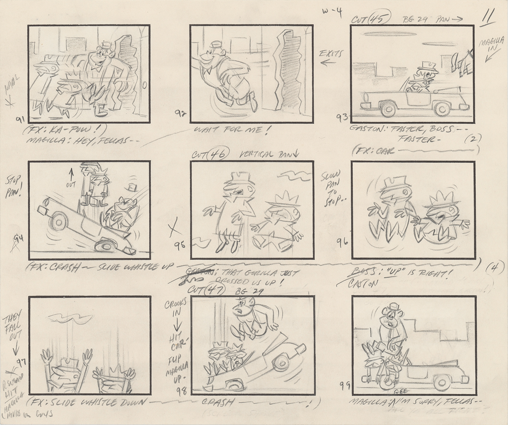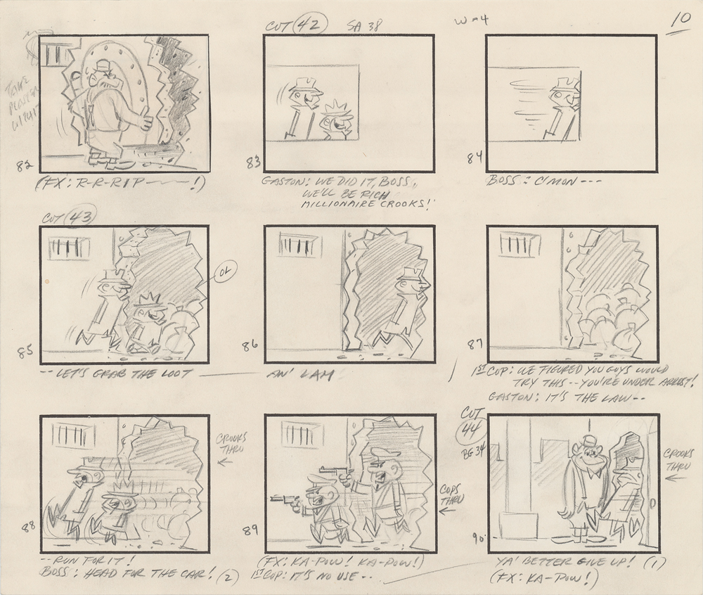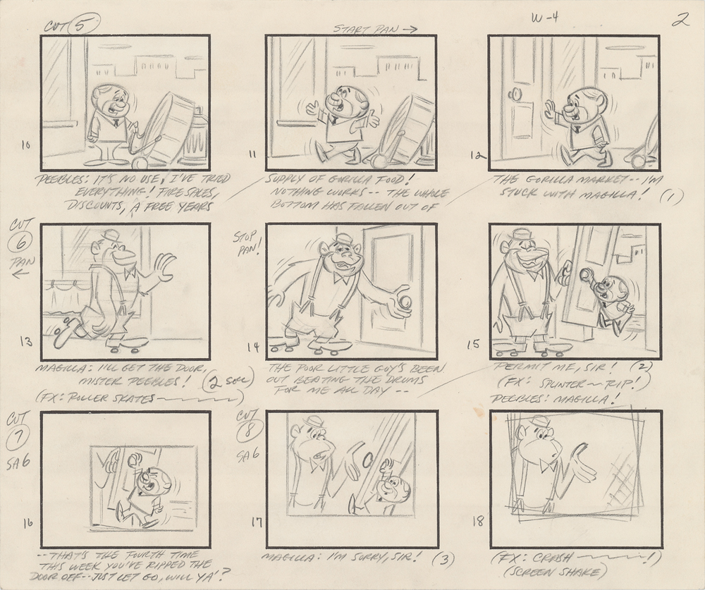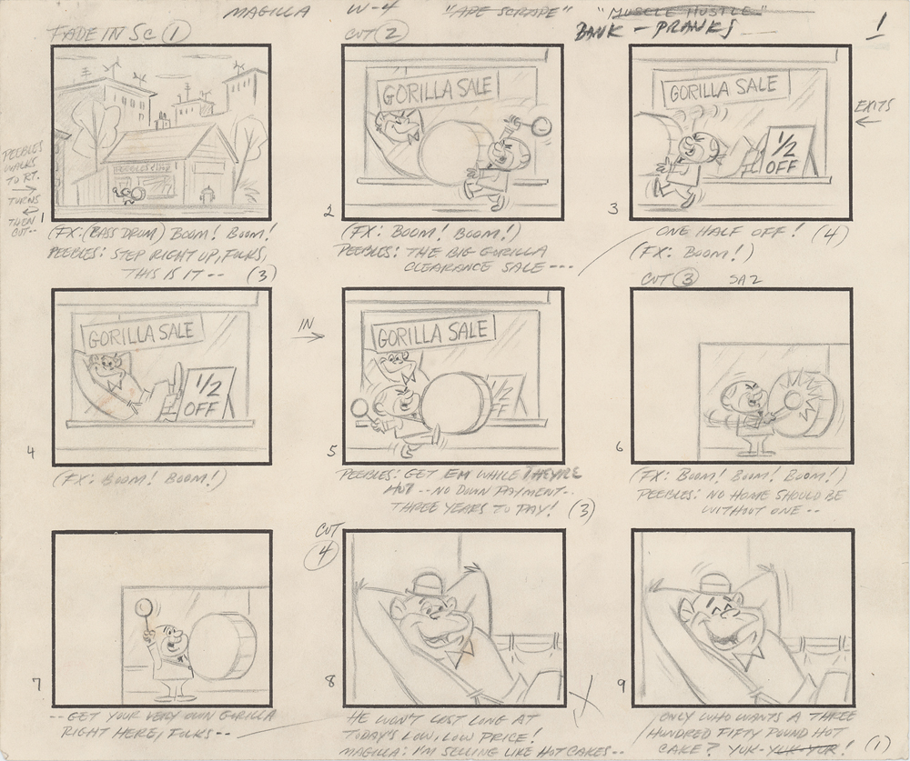 (Hanna-Barbera, 1964) Original complete 15-page hand-drawn storyboard for The Magilla Gorilla Show cartoon ‘Bank Pranks,’ the fourth episode of the first season, which aired on February 4, 1964. The storyboard contains 15 pages and a total of 132 drawings, which amounts to roughly nine drawings per page, with the majority bearing scene notes, directions, and dialogue. Each storyboard page is accomplished in graphite on untrimmed 12.5 x 10.5 animation paper. In fine condition, with expected wear from use. Accompanied by a certificate of authenticity from Howard Lowery. In the episode, Magilla accidentally becomes an accomplice in a bank robbery but ends up a high-finance hero.
