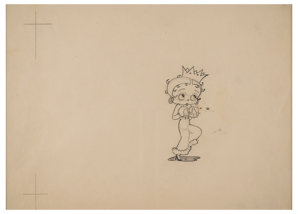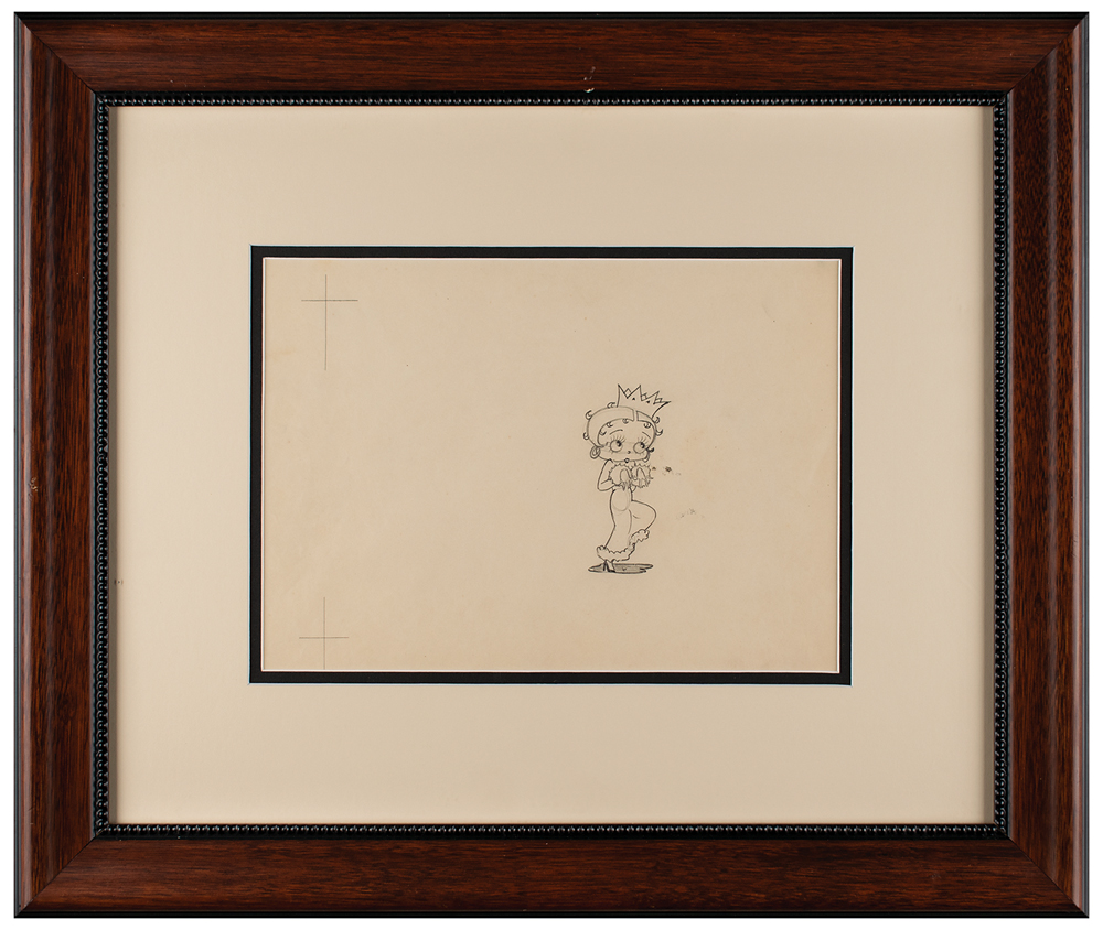 (Fleischer Studios, 1933) Original production drawing featuring Betty Boop from Betty Boop's May Party, showing her wearing a crown and taking a step forward. Accomplished in graphite on animation paper. Image measures 1.5 x 3.5, with a mat opening of 10.25 x 7.5. This piece is also framed to an overall size of 19.5 x 16.5. In fine condition.