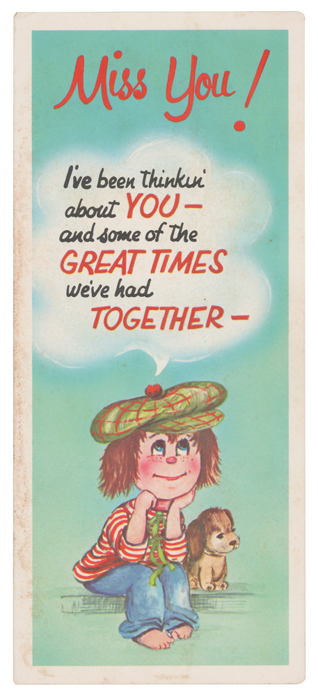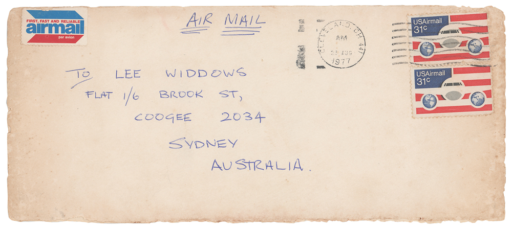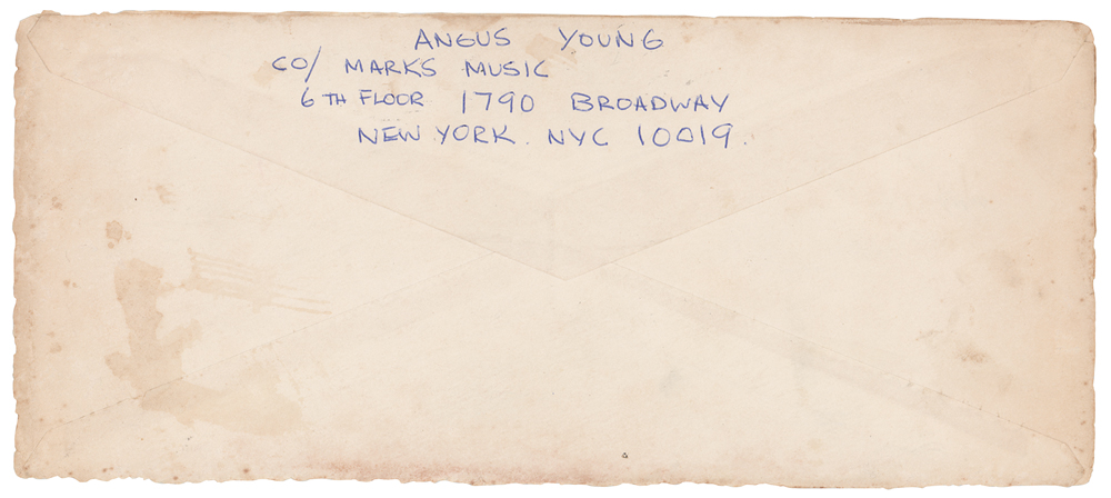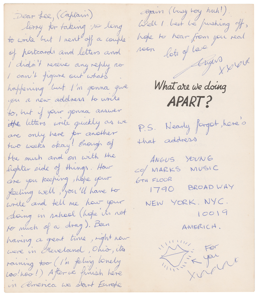 ALS signed “Angus, xxxx,” penned inside a greeting card, measures 8 x 9.25 open, postmarked at Cleveland, Ohio, on August 23, 1977. Letter to "Lee (Captain)," his then girlfriend Lee Widdows, in full: “Sorry for taking so long to write but I sent off a couple of postcards and letters and I didn’t receive any reply so I can’t figure out what’s happening but I’m gonna give you a new address to write to, but if your gonna answer the letters write quickly as we are only here for another two weeks okay! Enough of the mush and on with the lighter side of things. How are you keeping, hope your feeling well, you’ll have to write and tell me how your doing in school ( hope its not to much of a drag). Been having a great time, right now were in Cleveland, Ohio, its raining too (I’m feeling lonely boo! hoo!) After we finish here in America we start Europe again (busy boy hah!) Well I best be finishing off, hope to hear from you real soon.” Young adds a postscript: “P.S. Nearly forgot, here’s that address: Angus Young, CO/ Marks Music, 6th Floor, 1790 Broadway, New York. NYC., 10019, America.” At the bottom of the card Young has drawn a ‘kissing lips’ sketch and adds “For you, xxxxx.” In fine condition, with some soiling to the outside of the card. Accompanied by a certificate of authenticity from Tracks and by the original hand-addressed mailing envelope. This letter was written when AC/DC were in Cleveland, Ohio, to perform at the Agora Ballroom on August 22, 1977, during the group’s ‘Let There Be Rock’ tour. After the Cleveland show, the band moved on to New York to perform concerts at the Palladium and CBGB, both on August 24, 1977.