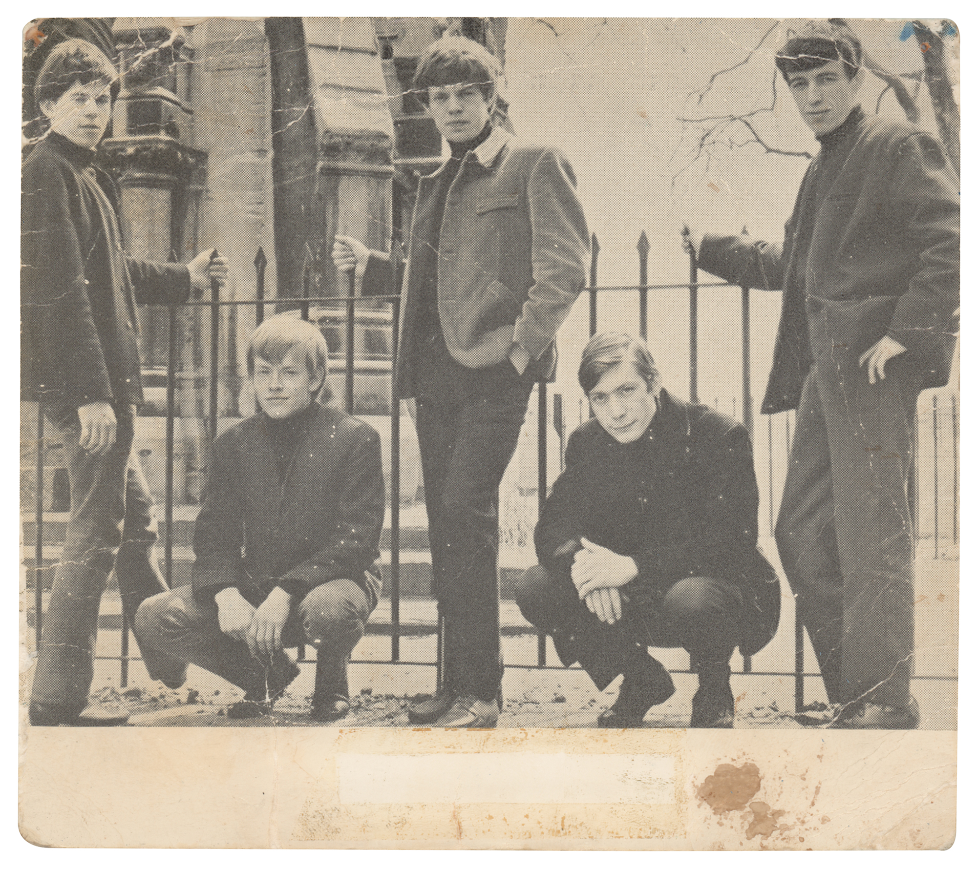 Vintage circa 1963 Rolling Stones fan club promo card (the earliest form of a Stones fan club card), 5.25 x 4.75, signed on the reverse in black ink, "Mick Jagger," "Brian Jones," "Keith Richard," and "Charlie Boy, xxx," and in ballpoint, "Bill Wyman." Caption on reverse lists the address of fan club national secretary Diane Nelson. In very good condition, with overall creasing and scattered staining. Accompanied by a certificate of authenticity from Tracks, which states that the signatures were "obtained at the Oasis Club in Manchester, England on 30th August 1963."