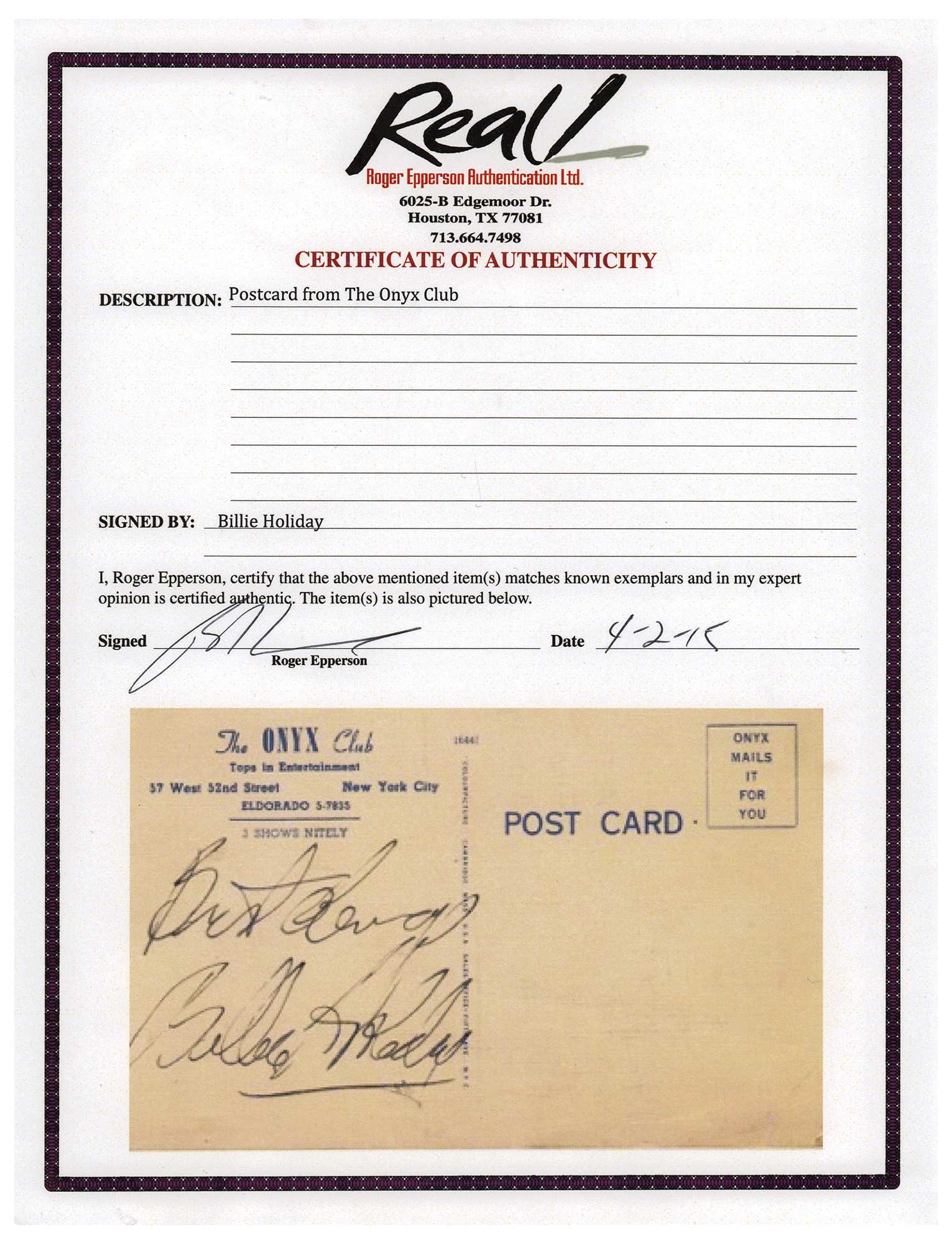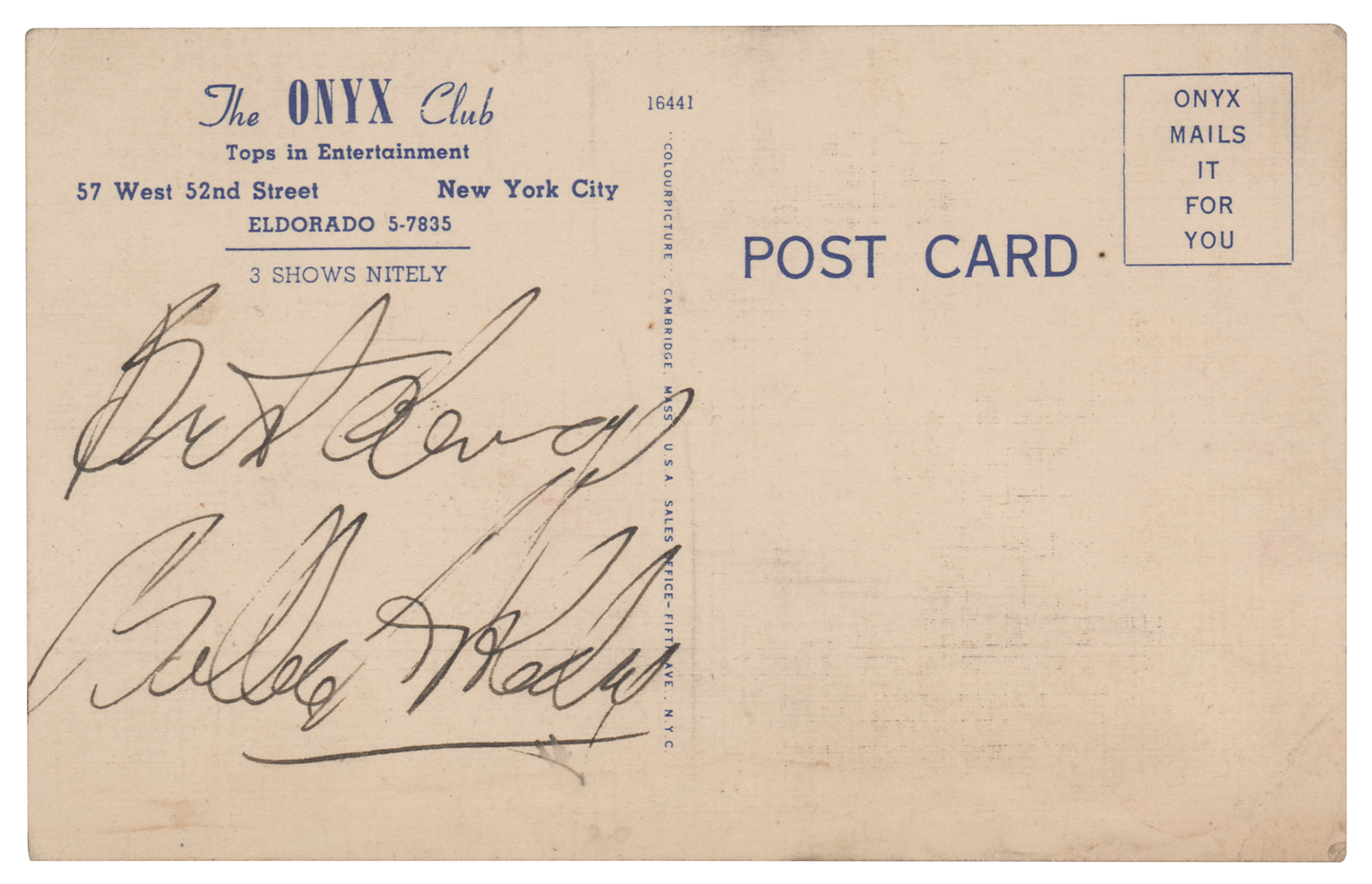 Vintage ink signature, "Best always, Billie Holiday,” on the reverse of a gorgeous color 3.5 x 5.5 postcard from The Onyx Club in New York City, with caption below reading: "Billie Holiday, America's Foremost Song Stylist, Appearing at the Onyx Club Nitely." In fine condition. Accompanied by a full letter of authenticity from REAL.
