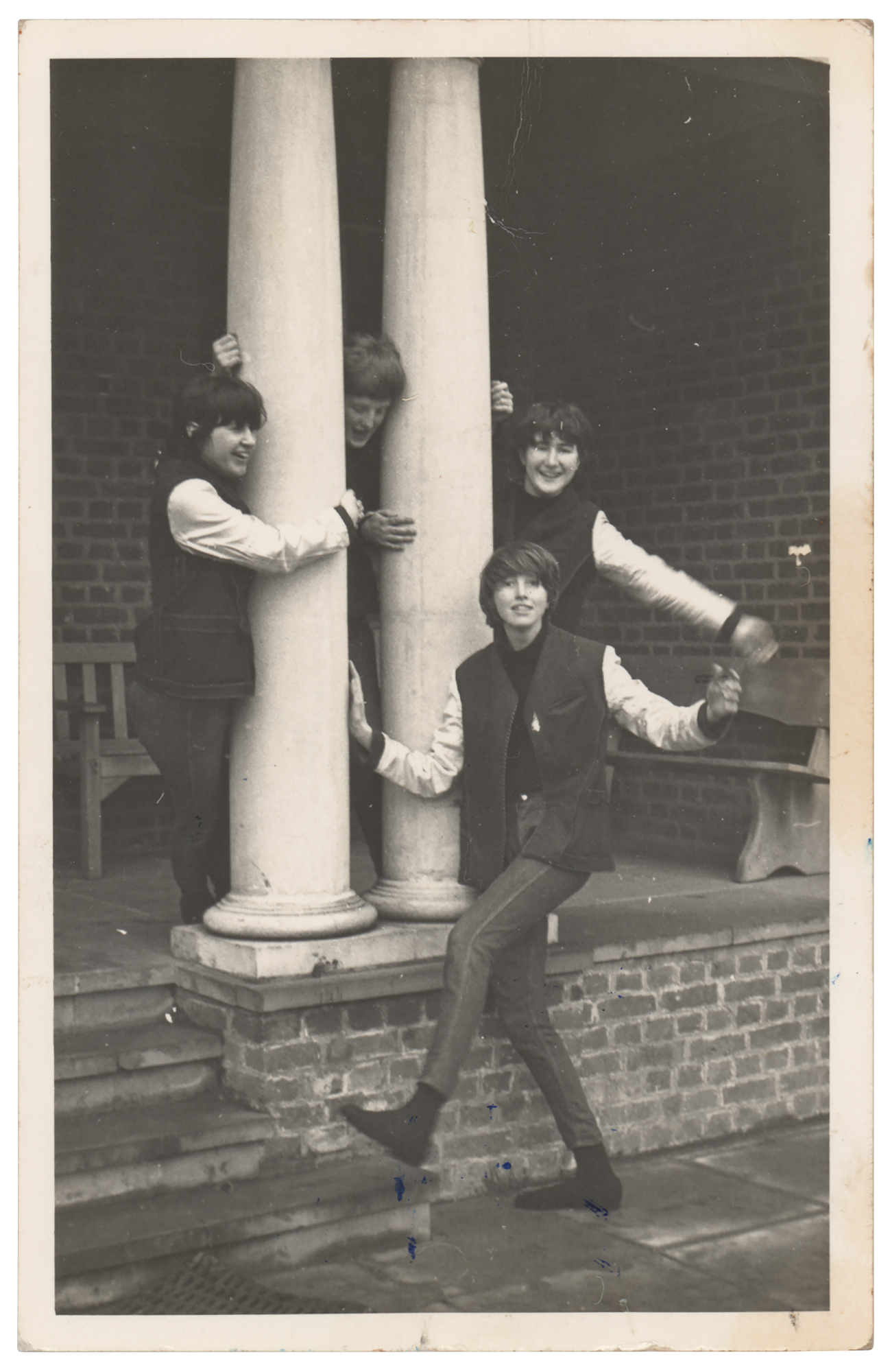 Vintage glossy 3.5 x 5.5 photo of four schoolgirls dressed as the Beatles for a play at the St. Helen's School in Northwood, Middlesex in 1964, signed on the reverse in blue ballpoint, "Paul McCartney," "George Harrison (B.A.)," and "John Lennon," and in black ink, "Ringo Starr." Reverse of card is initialed "RB" and dated in another hand, "17. 2. 64." In fine condition, with light staining to the top edge.