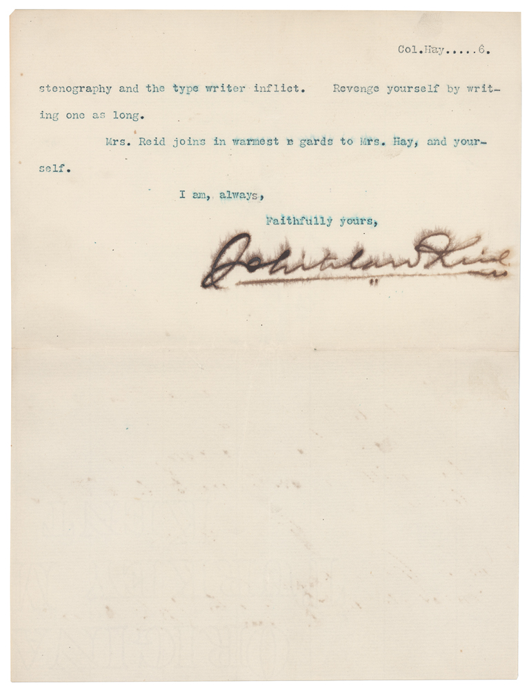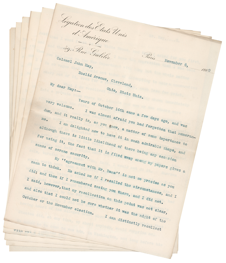 American politician and journalist (1837-1912) who, among other accomplishments, edited the New York Tribune and served as Ambassador to France and the United Kingdom. During the American Civil War, Reid wrote under the by-line 'Agate,' and acted as a correspondent at several battlefields, including the Battles of Shiloh and Gettysburg. TLS as the U.S Minister to France, six pages, 7.5 x 10, Legation des Etats Unis d'Amerique letterhead, November 6, 1889. Lengthy letter to future Secretary of State John Hay, attempting to recall a deal he had made with Assistant Secretary of War Charles Dana at the White House 25 years ago, in part: "My 'agreement with Mr. Dana's is not so precise as you seem to think. He asked if I recalled the circumstances, and I did; and then if I remembered seeing you there, and I did not. I said, however, that my recollection on this point was not clear, and also that I could not be sure whether it was the night of the October or the November election. I can distinctly recollect that I went first to the White House, and that I asked for you first, and then for Mr. Lincoln. I have the impression that I was told you had gone to the War Department with him; but the whole matter is so vague that I would not think of attempting to make a consecutive story out of it, even for a private letter, much less for print.