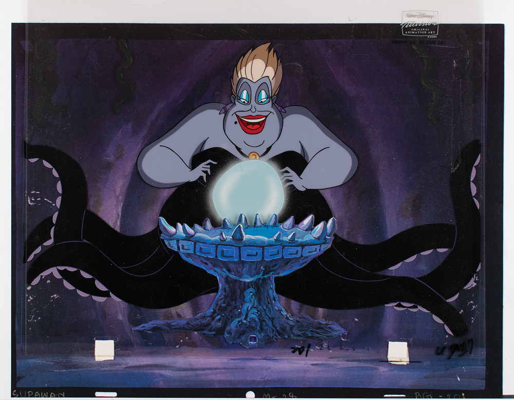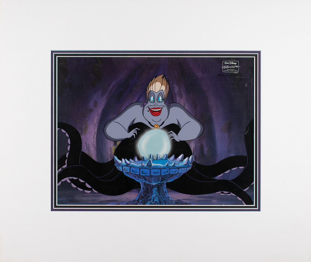 (Walt Disney Studios, 1994) Original production cels of Ursula using her crystal ball in 'Heroes,' the twenty-eighth episode of The Little Mermaid TV series, which originally aired on October 15, 1994. The cels, which are marked "W17" and "U73," are placed on a matching Disney litho background, which includes a matching cauldron litho applied to the foreground. Images measure 12.25 x 7.75 (Ursula) and 2 x 2 (crystal ball), with overall dimensions of 14 x 11.75. The piece has the silver Walt Disney Television seal to upper right, which is stamped below: "Show 28, Scene 201." Double-matted and in fine condition. Accompanied by a certificate of authenticity from Disney Enterprises.
