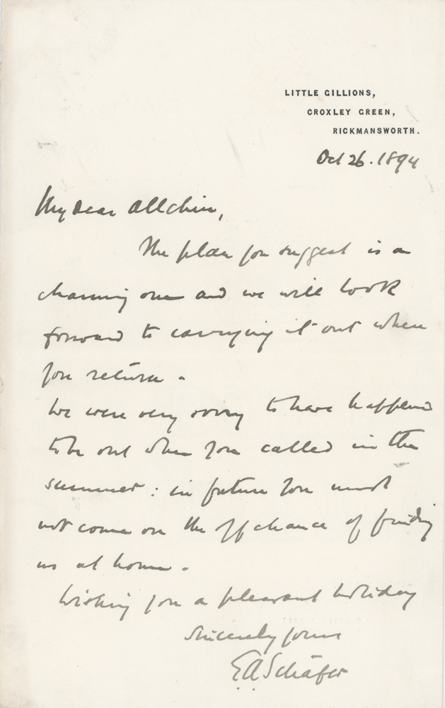 English physiologist (1850-1935) regarded as a founder of endocrinology, who discovered and demonstrated the existence of adrenaline and coined the terms 'endocrine' and 'insulin.' ALS signed “E. A. Schafer,” one page, 4.25 x 7, personal letterhead, October 26, 1894. Letter to Dr. Allchin, in part: "The plan you suggest is a charming one and we will look forward to carrying it out when you return. We were very sorry to have happened to be out when you called in the summer: in the future you must not come on the off chance of finding us at home." In fine condition.