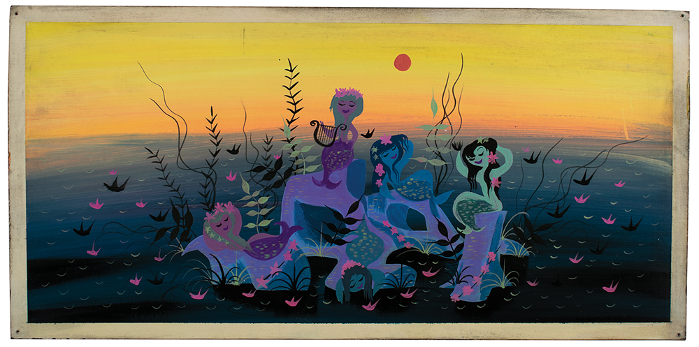 (Walt Disney Studios, 1951) Tremendous original panoramic concept painting by Mary Blair for Peter Pan, which shows several mermaids at Mermaid Lagoon. A beautiful sinking sun sets the scene: a group of five lovely and carefree mermaids enjoy themselves as they lounge on tidal rocks at their favorite Neverland gathering place: Mermaid Lagoon. Accomplished in tempera on 19 x 9.5 artist's board. In fine condition, with tack holes to corners. Blair was a concept artist for Disney during the 1940s and early 1950s, working on designs for such films as Peter Pan, Cinderella, and Alice in Wonderland. She also created designs for several Disney attractions (including It's a Small World), and her largest work ever, the multi-story mosaic in Disney World's Contemporary Hotel concourse. A gorgeous, tropical panoramic concept artwork by a Disney legend.